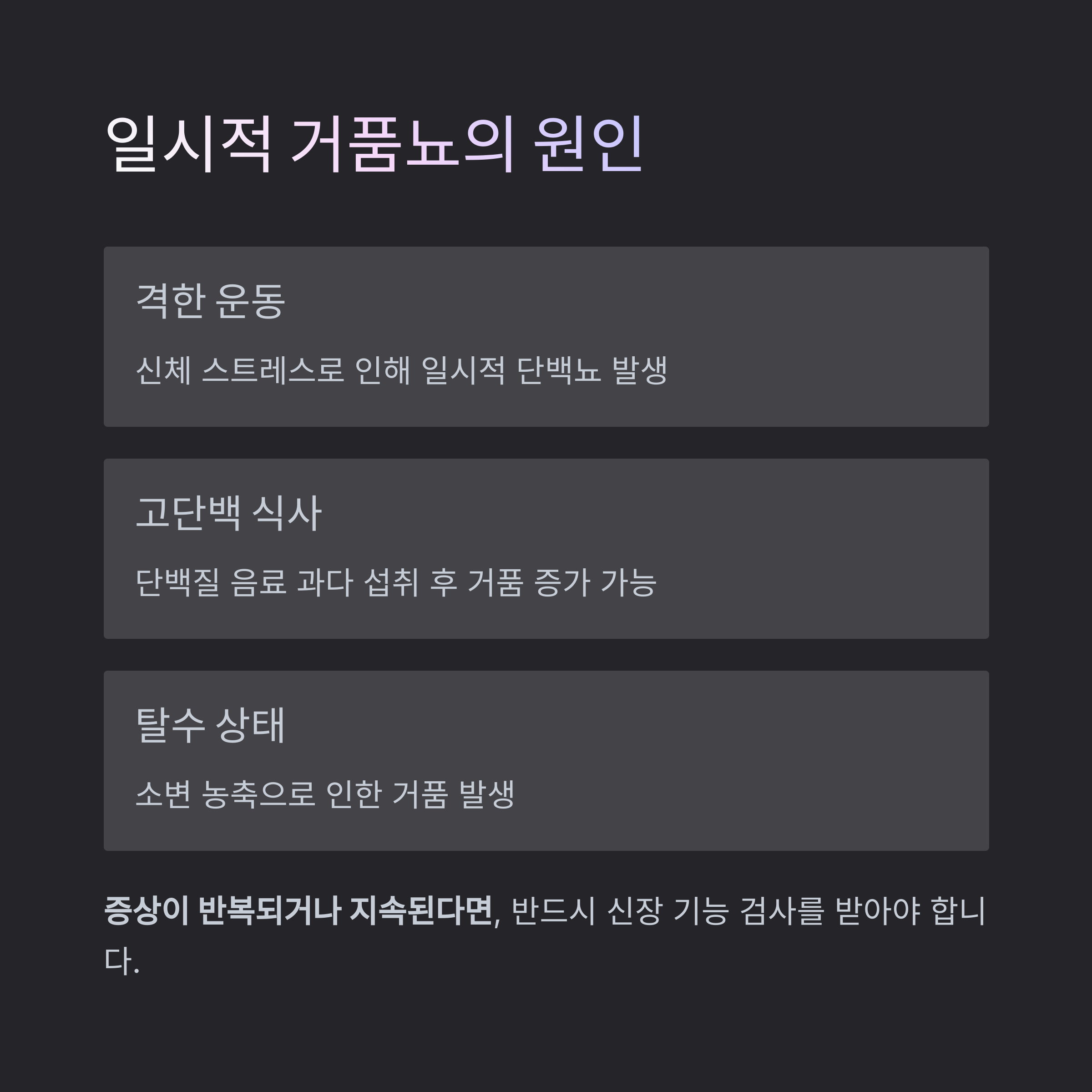 다음과 같은 일시적 요인들도 거품뇨를 유발할 수 있습니다: