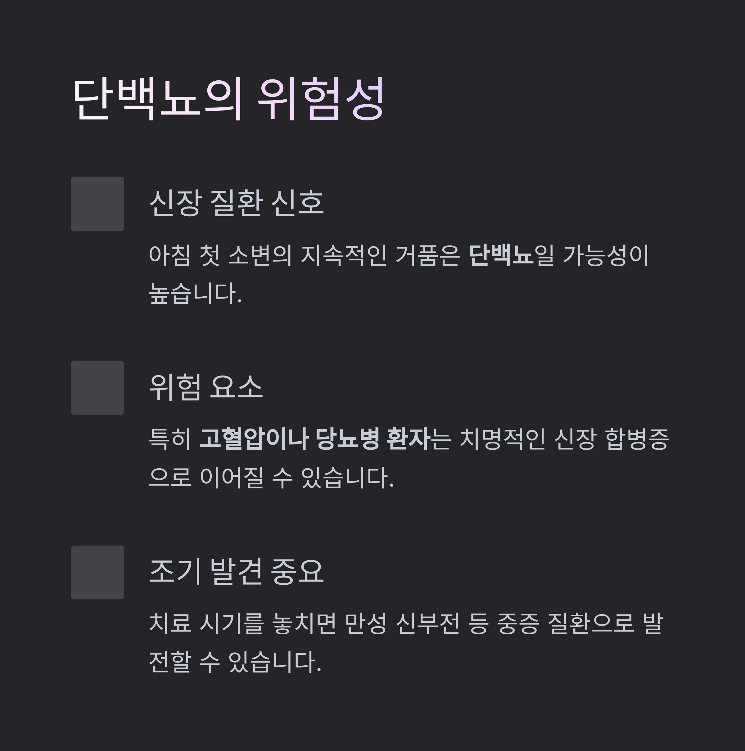 단백뇨는 신장 질환의 대표적인 초기 증상으로, 치료 시기를 놓치면 만성 신부전 등 중증 질환으로 발전할 수 있습니다.