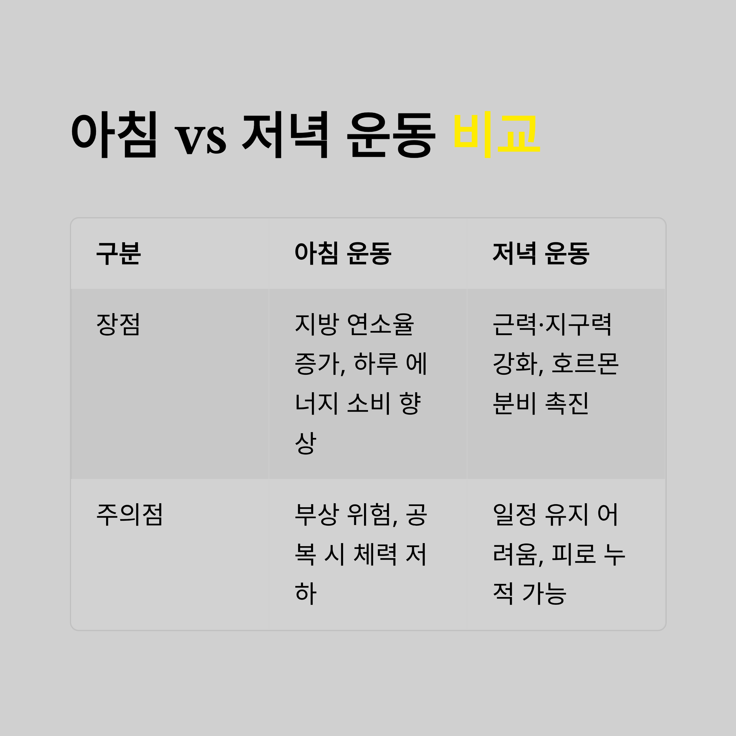 아침 vs 저녁 운동 비교 표