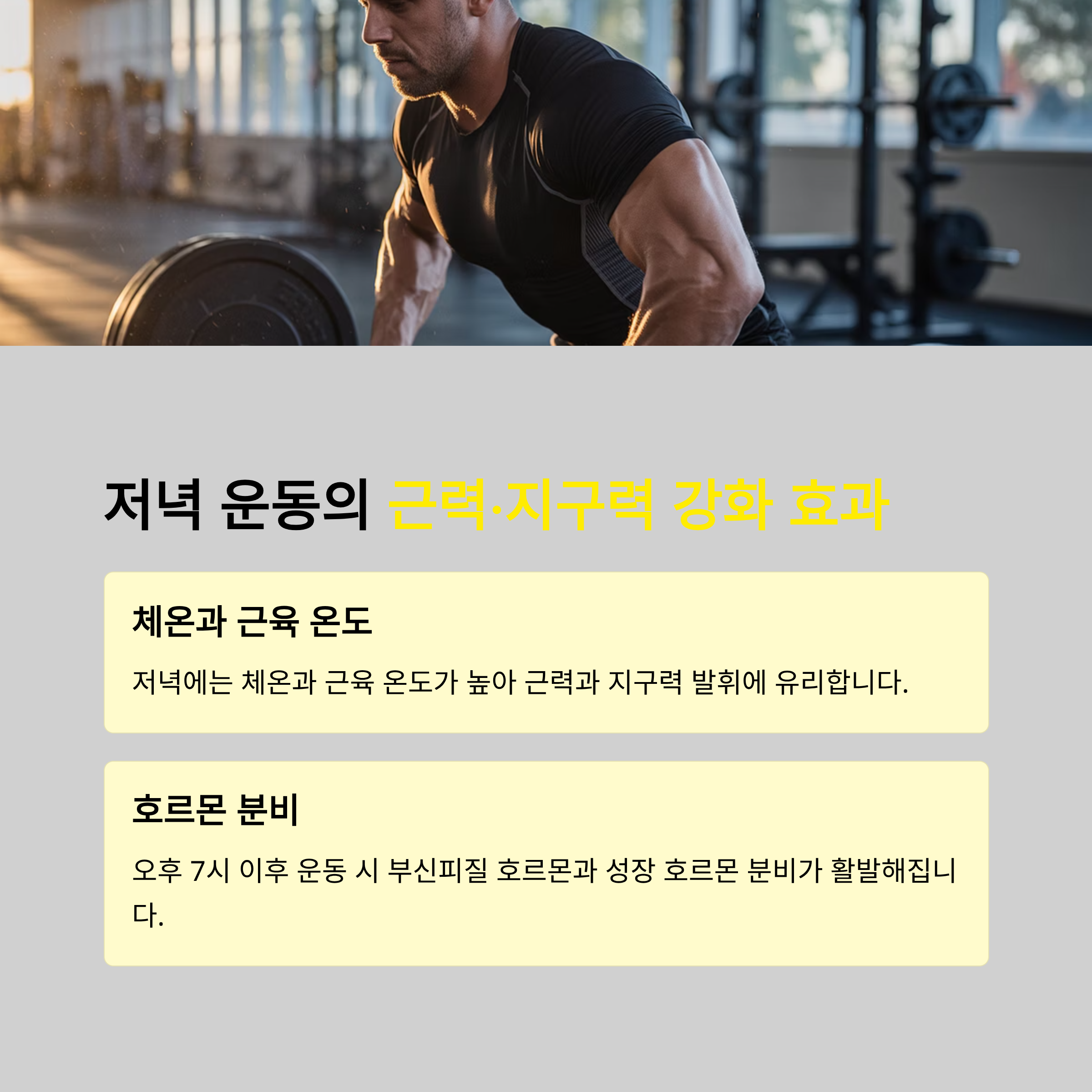 저녁 운동은 근력 강화와 지구력 향상에 유리합니다.