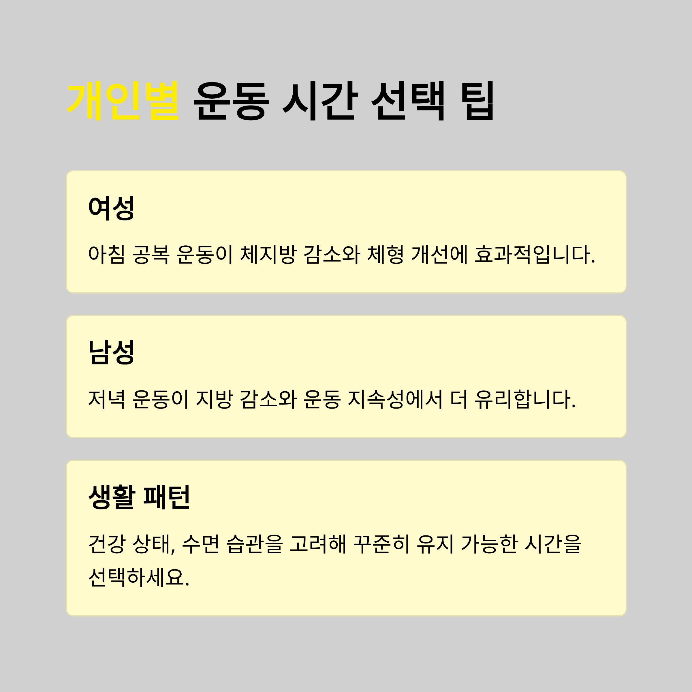 다만 성별과 개인 생활 패턴에 따라 최적의 운동 시간이 달라질 수 있습니다.