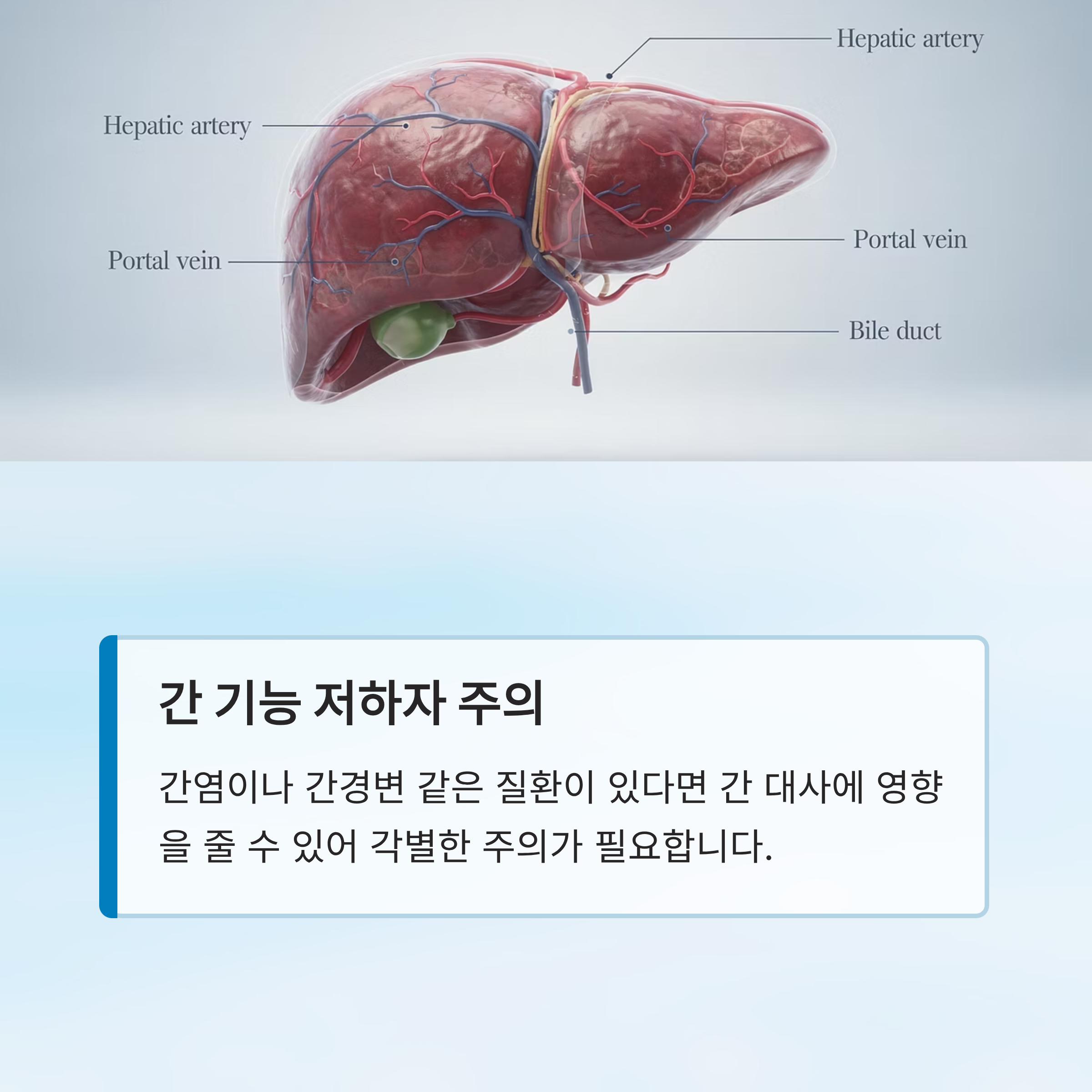 특히 간염이나 간경변 같은 질환을 앓고 있다면, 간 대사에 영향을 줄 수 있어 주의해야 해요.