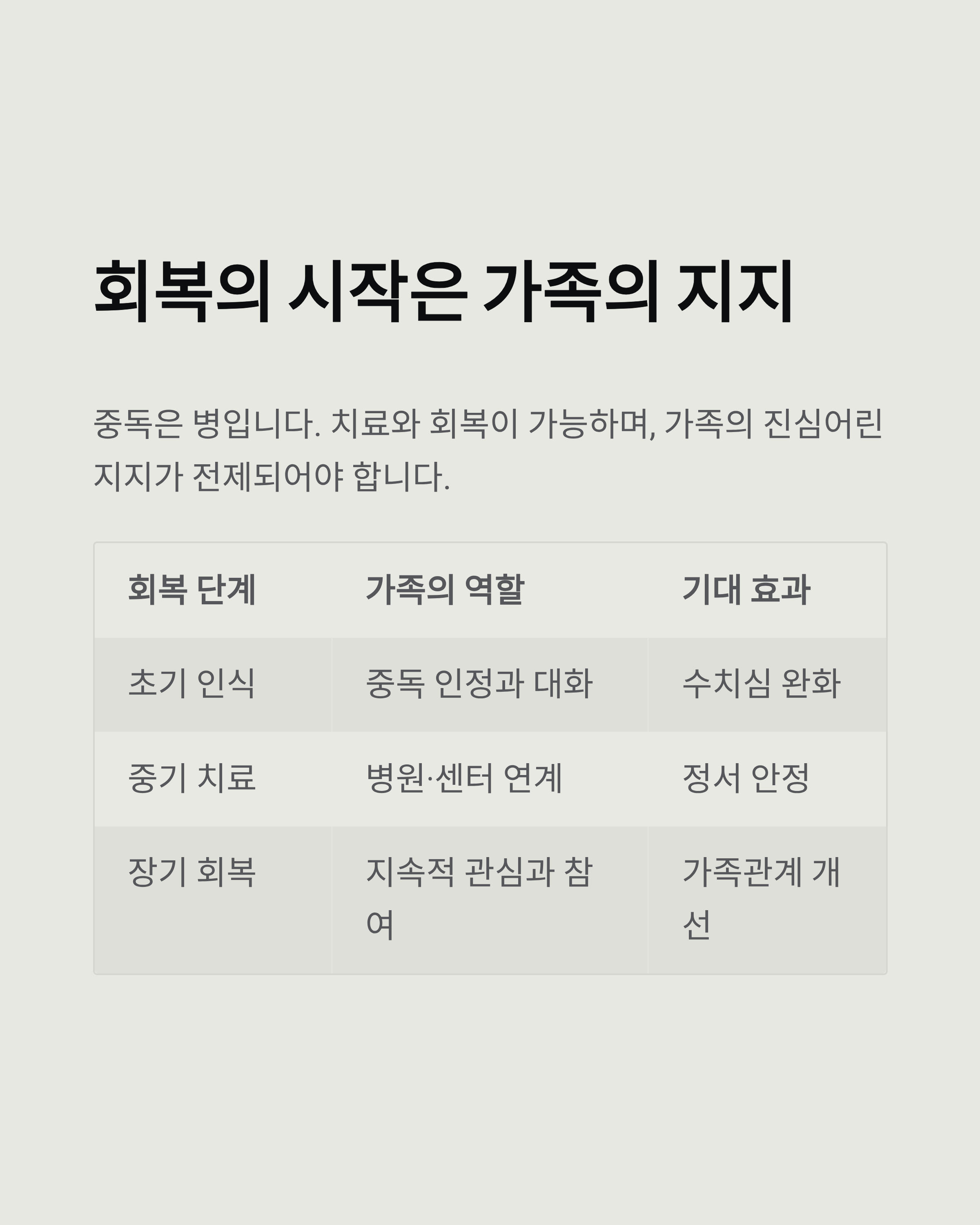 | 장기 회복 | 지속적 관심과 참여 | 가족관계 개선, 재발 방지 |