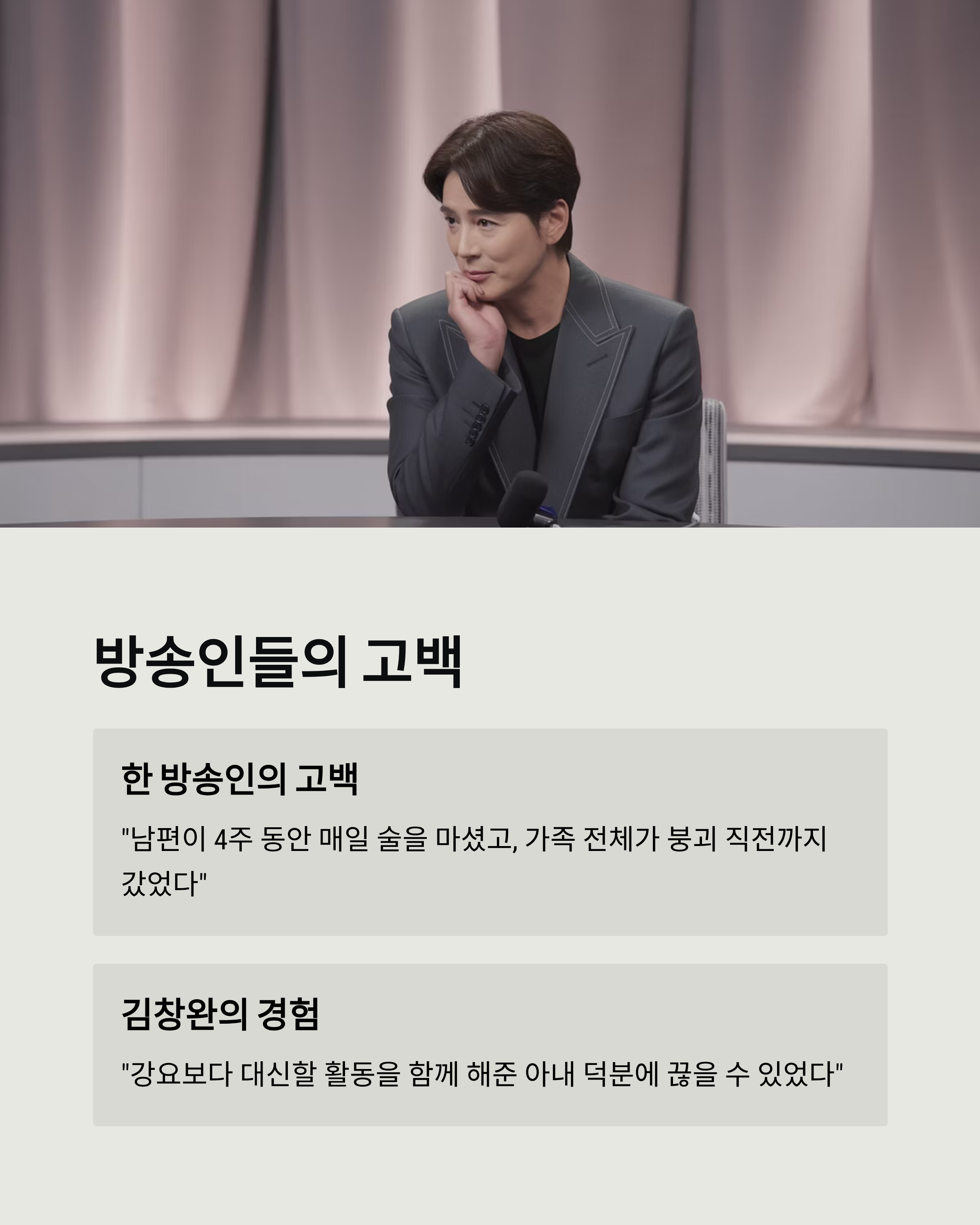 가수 김창완도 과거 알코올중독 문제를 겪은 가족의 일원으로서 솔직한 경험담을 나누었습니다. 그는 "음주를 못 하게 강요하기보다, 대신할 수 있는 활동을 함께 해준 아내 덕분에 끊을 수 있었다"고 말했죠. 이처럼 가족의 고통은 때로 회복의 열쇠이기도 합니다.