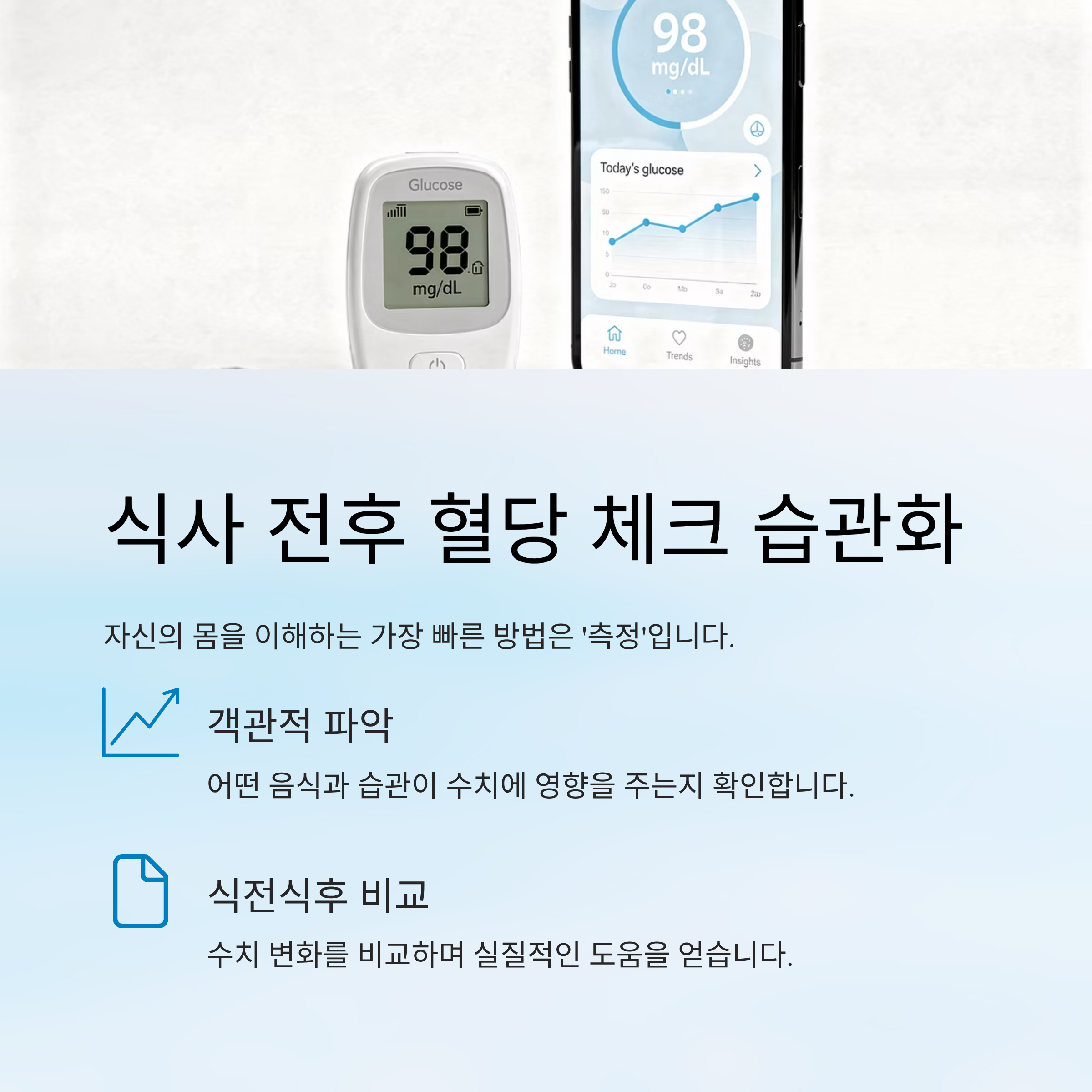 혈당 체크를 생활화하면 어떤 음식이나 습관이 본인의 수치에 어떤 영향을 주는지 객관적으로 파악할 수 있어요. 특히 식사 전후 수치를 비교해 보는 습관은 실질적인 도움이 됩니다.