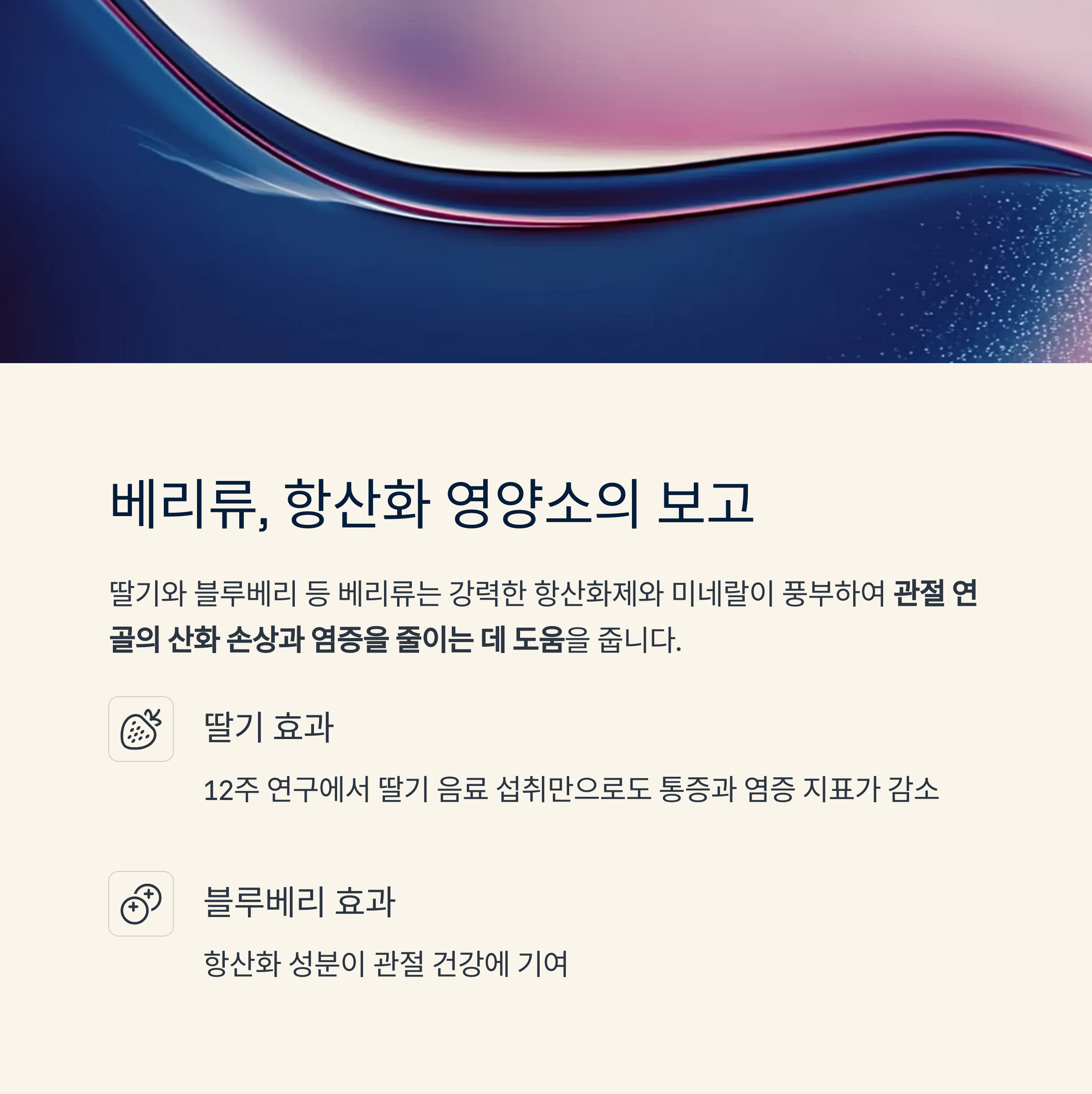 | 베리류 | 미국 임상연구 | 딸기 50g, 블루베리 4g / 염증·통증·보행능력 개선 |
