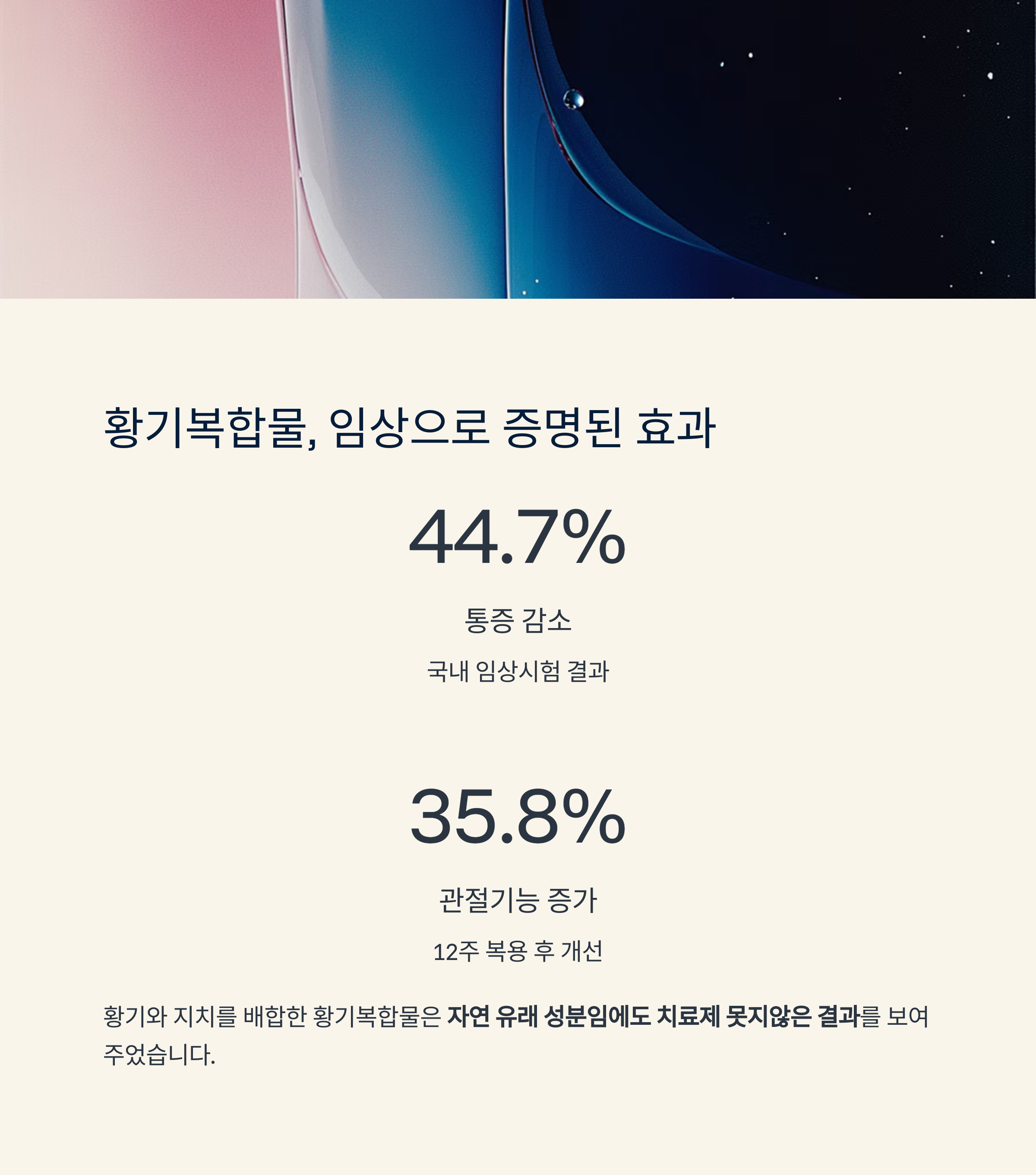 | 황기복합물 | 국내 임상(88명 대상) | 12주 복용 / 통증 44.7%↓, 기능 35.8%↑ |