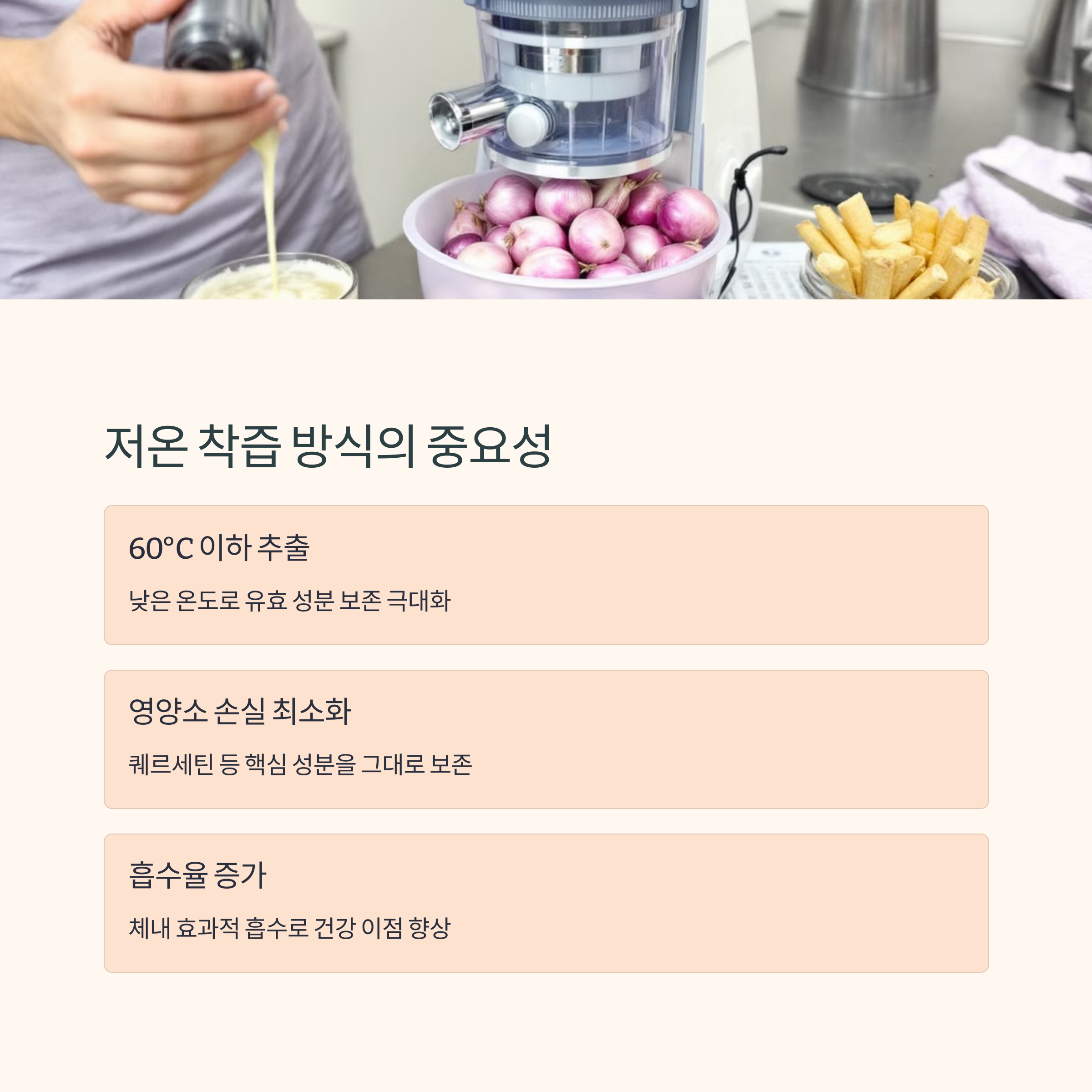 직접 짜낸 양파즙도 효과는 있지만, 퀘르세틴 함량을 최대한 보존하려면 저온 착즙 방식이 좋습니다.