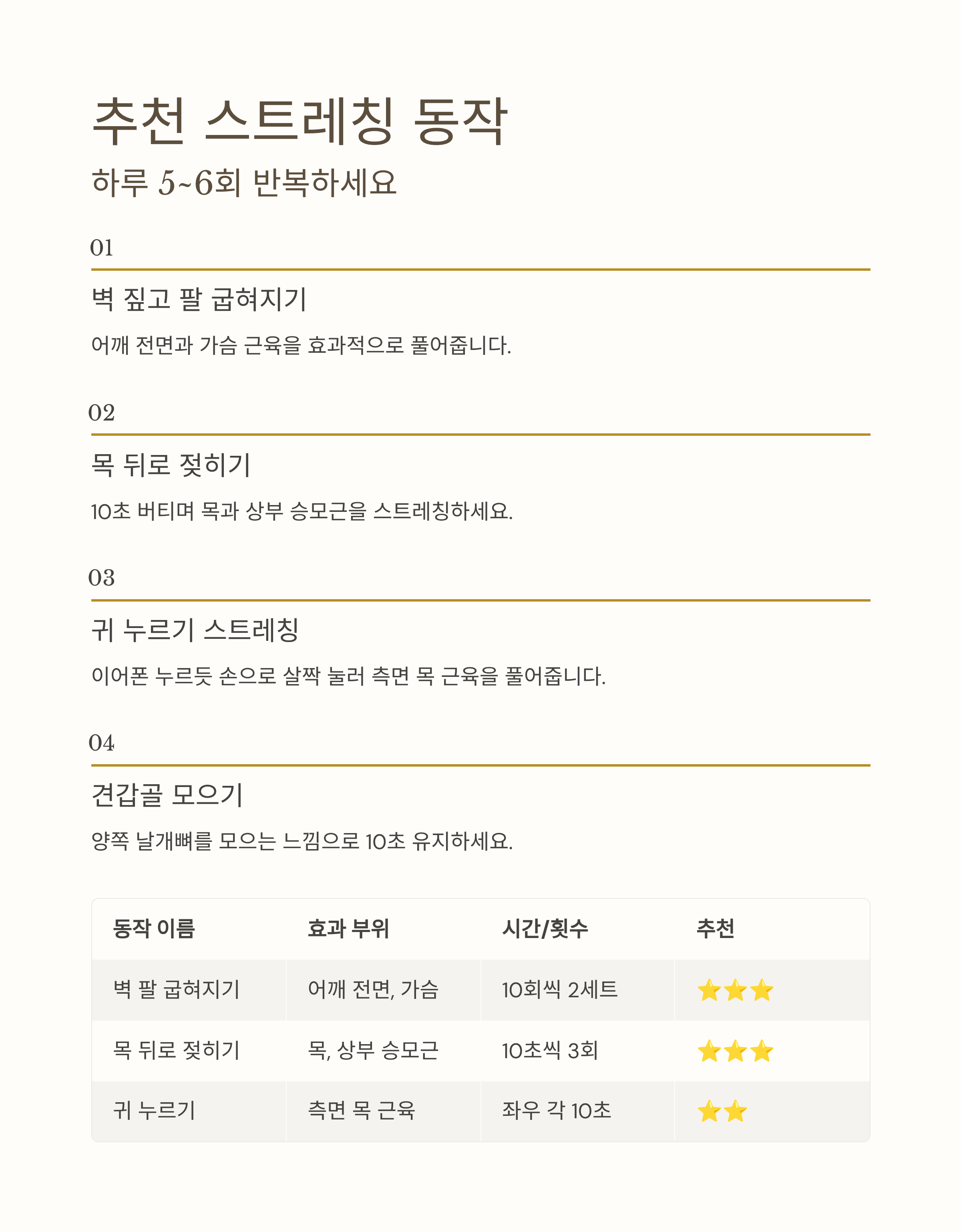 | 귀 누르기 스트레칭 | 측면 목 근육 | 좌우 각각 10초 |