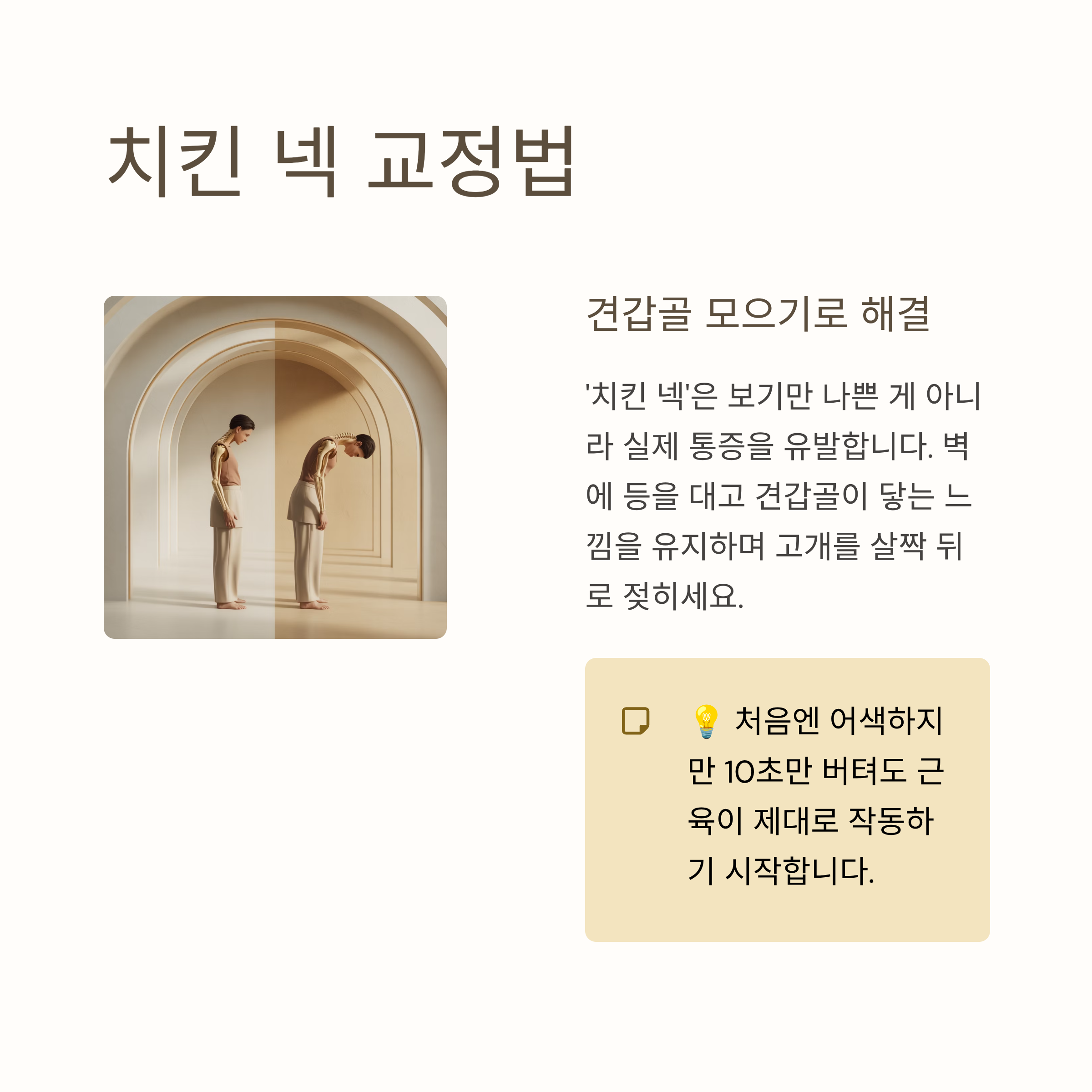 ‘치킨 넥’이라고 불리는 잘못된 자세는 단순히 보기만 나쁜 게 아니라 실제 통증을 유발합니다. 이럴 땐 벽에 등을 대고 섰을 때 견갑골이 닿는 느낌을 유지하며 고개를 살짝 뒤로 젖히는 동작이 효과적이에요. 처음에는 어색하지만 10초만 버텨도 근육이 제대로 작동하기 시작합니다.