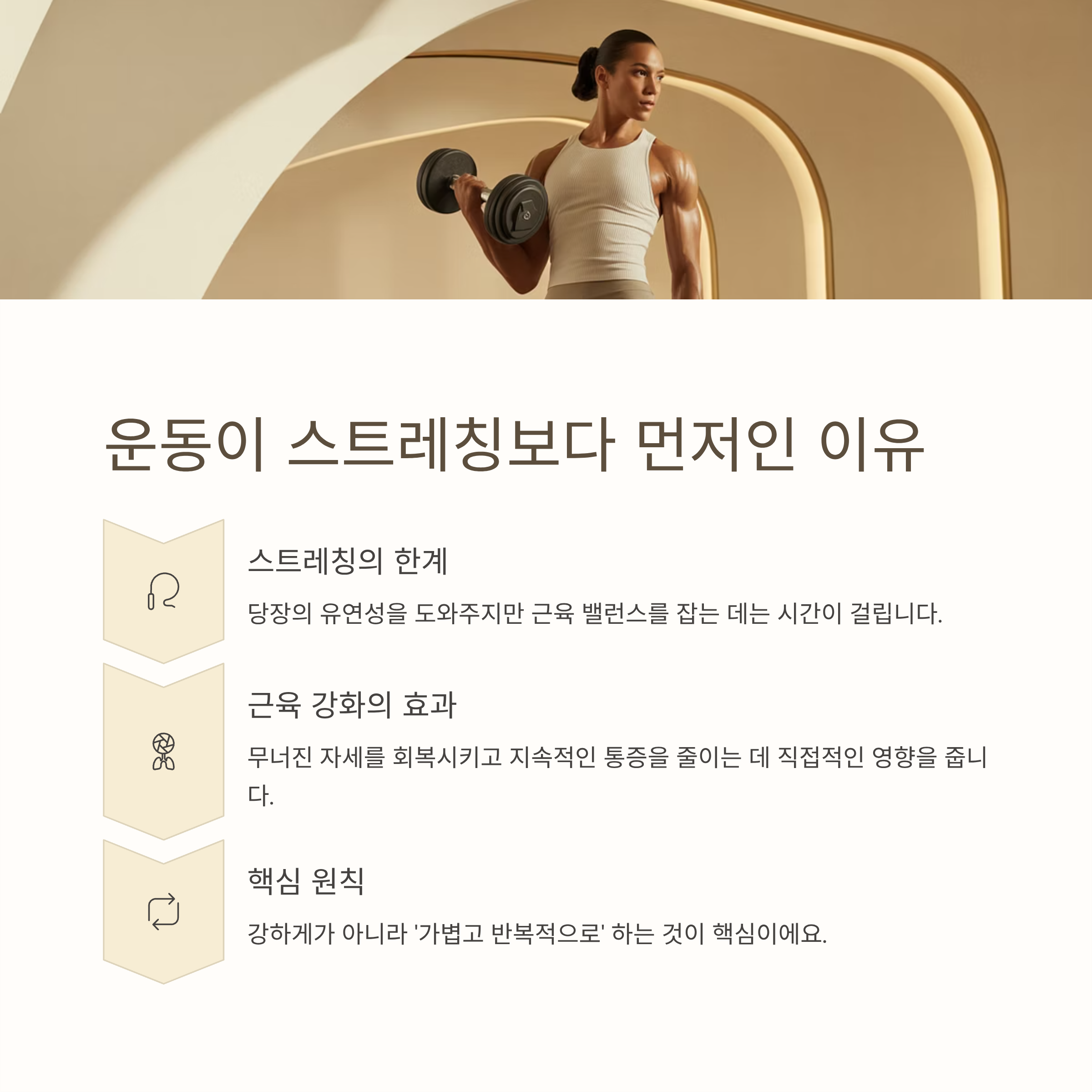 사실 스트레칭은 당장의 유연성을 도와주지만, 근육의 밸런스를 다시 잡는 데는 시간이 걸립니다. 반면 근육 강화 운동은 무너진 자세를 회복시키고, 지속적인 통증을 줄이는 데 직접적인 영향을 줍니다. 강하게가 아니라 ‘가볍고 반복적으로’ 하는 것이 핵심이에요.