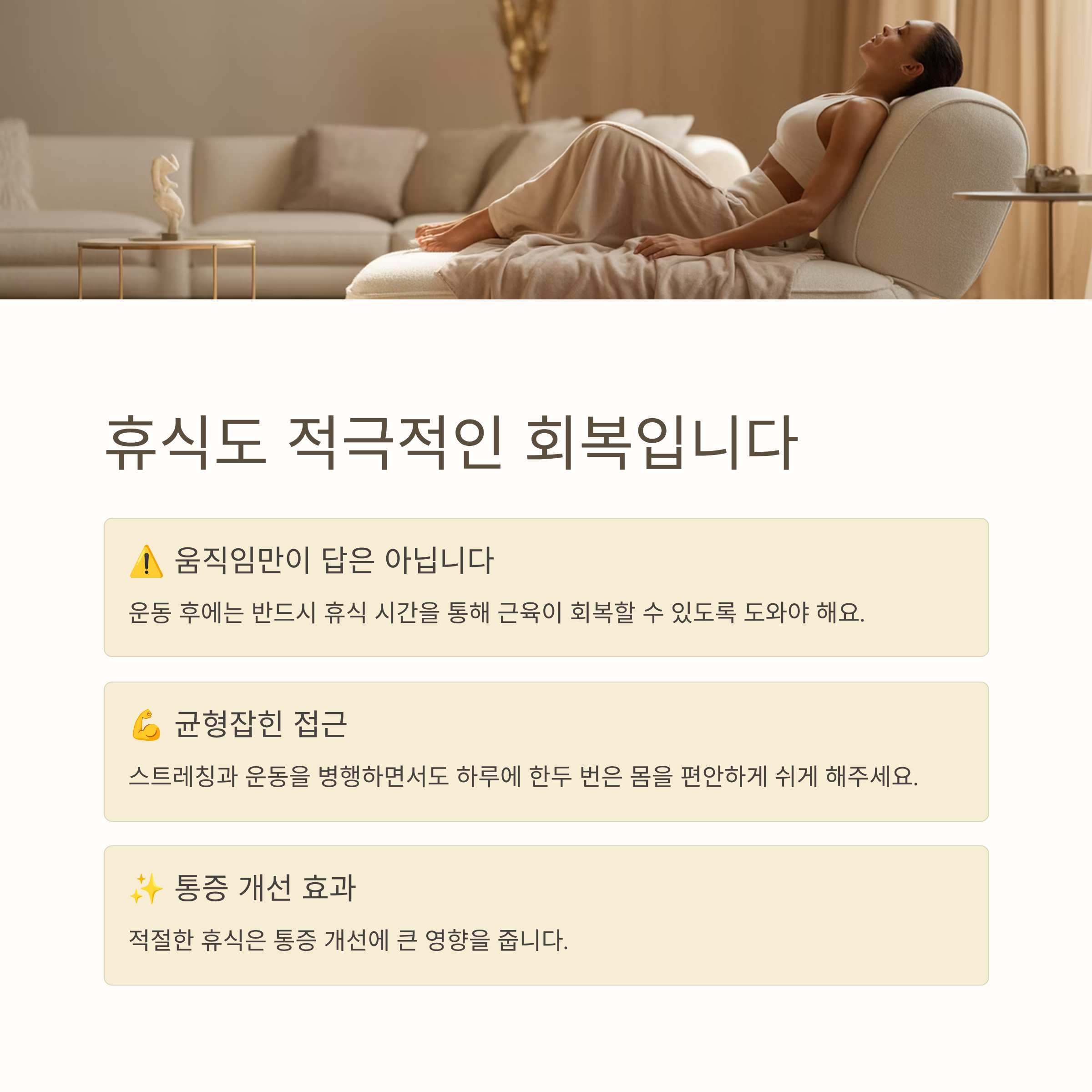 움직이기만 한다고 능사가 아닙니다. 운동 후에는 반드시 휴식 시간을 통해 근육이 회복할 수 있도록 도와야 해요. 스트레칭과 운동을 병행하면서도 하루에 한두 번은 몸을 편안하게 쉬게 해주는 것도 통증 개선에 큰 영향을 줍니다.