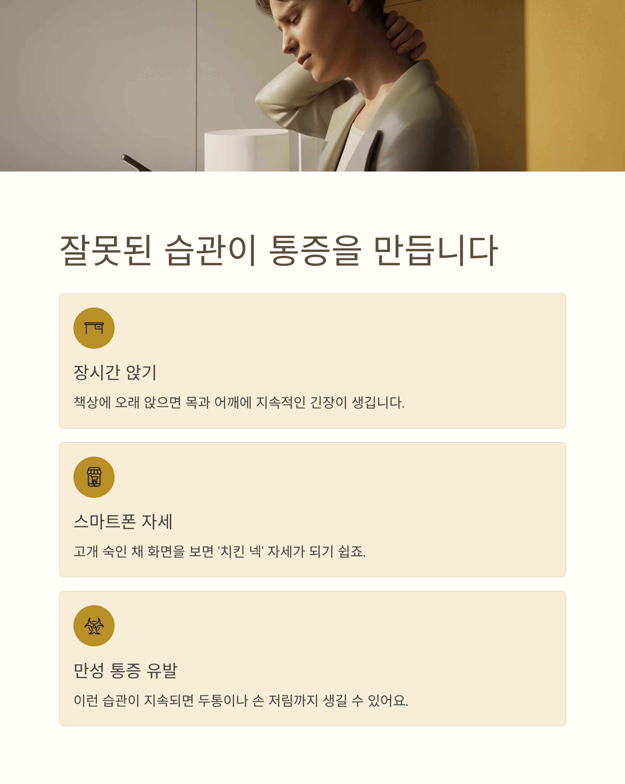 책상에 오래 앉아 있거나 스마트폰을 고개 숙인 채 보는 자세는 목과 어깨에 지속적인 긴장을 유발합니다. 특히 화면을 눈높이에 맞추지 않으면 목이 앞으로 빠지고 어깨가 말리면서 ‘치킨 넥’ 자세가 되기 쉽죠. 이런 습관이 지속되면 어깨 통증뿐 아니라 두통이나 손 저림까지 유발할 수 있습니다.