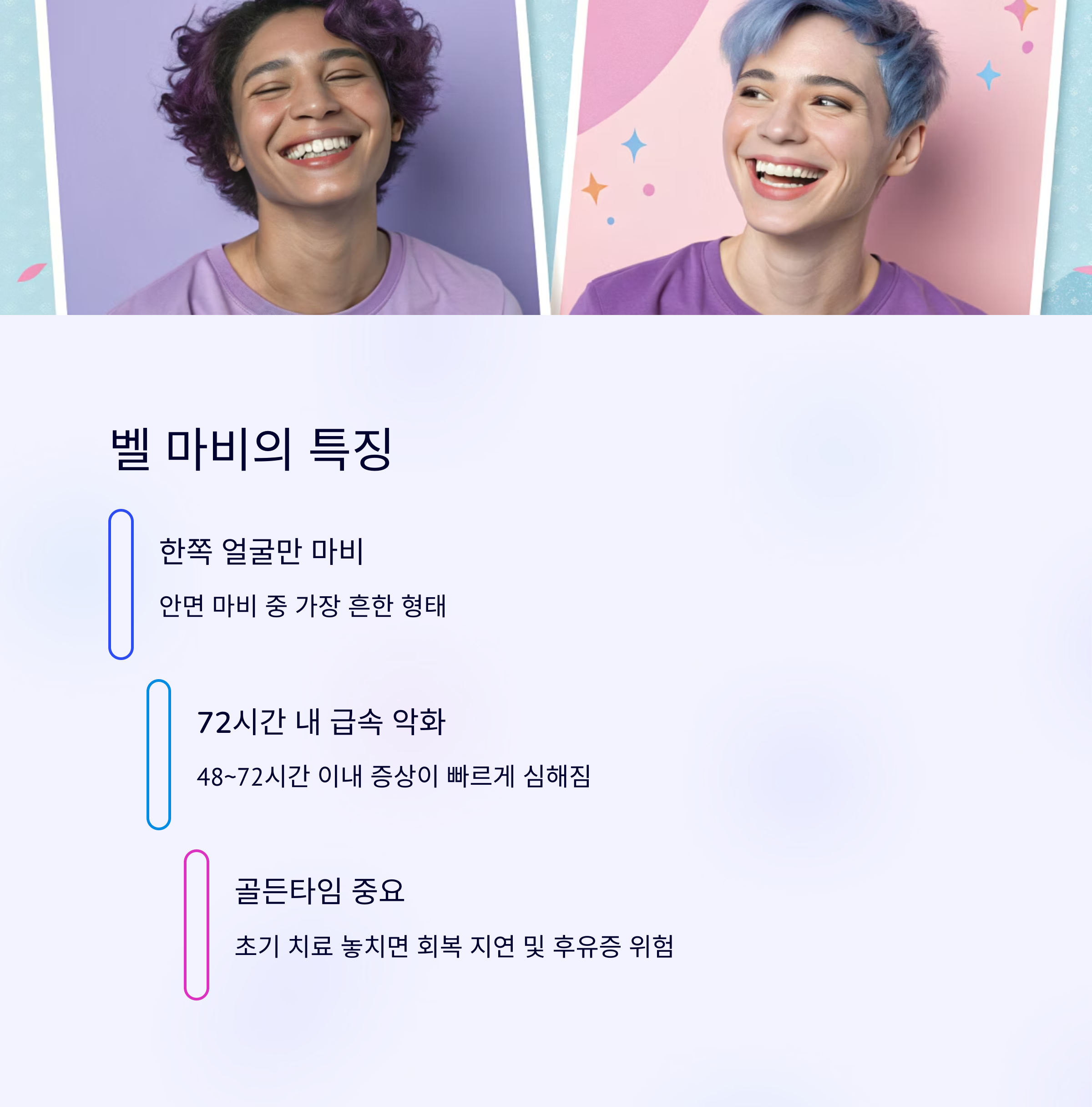벨 마비는 안면 마비 중에서도 가장 흔한 형태이며, 주로 얼굴 한쪽만 영향을