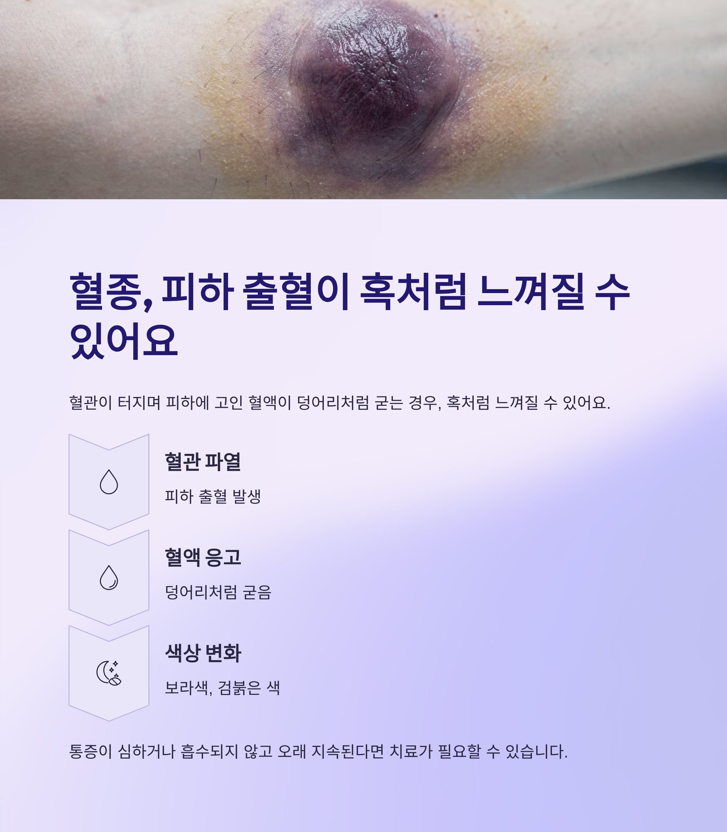 혈관이 터지며 피하에 고인 혈액이 덩어리처럼 굳는 경우, 혹처럼 느껴질 수 있어요.