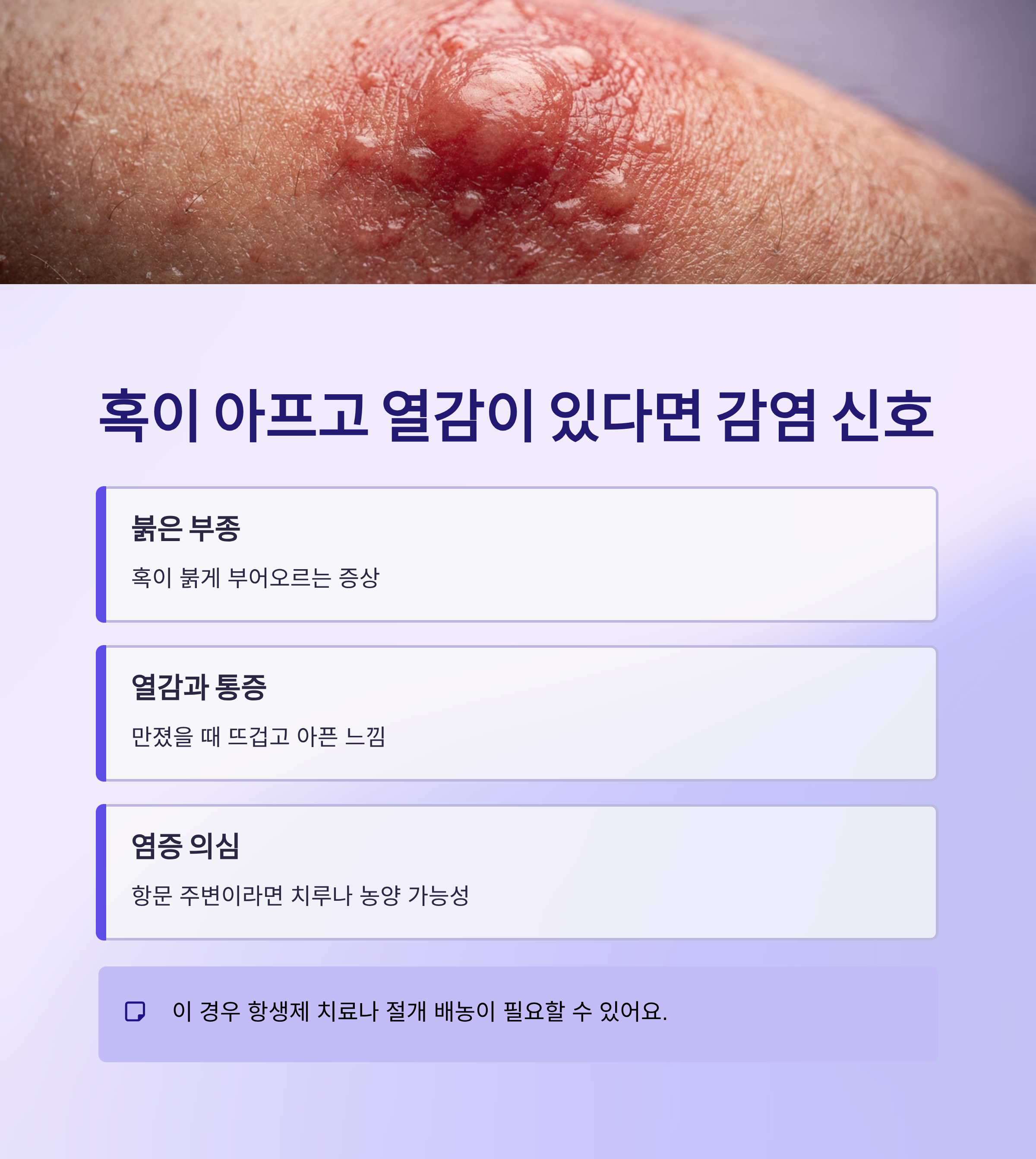 혹이 붉게 부어오르고, 만졌을 때 열감이나 통증이 느껴진다면 염증 또는 감염을 의심할 수 있어요.
