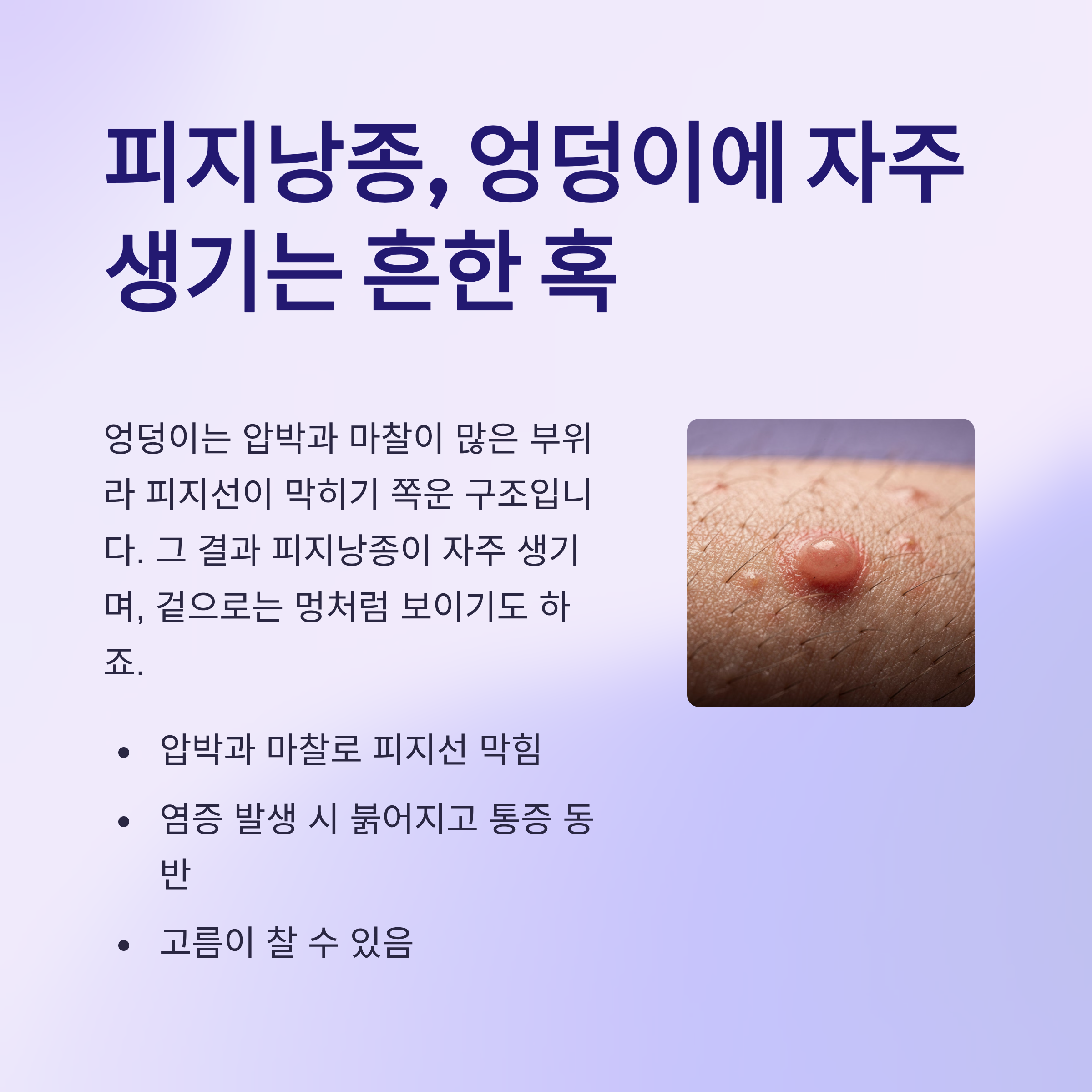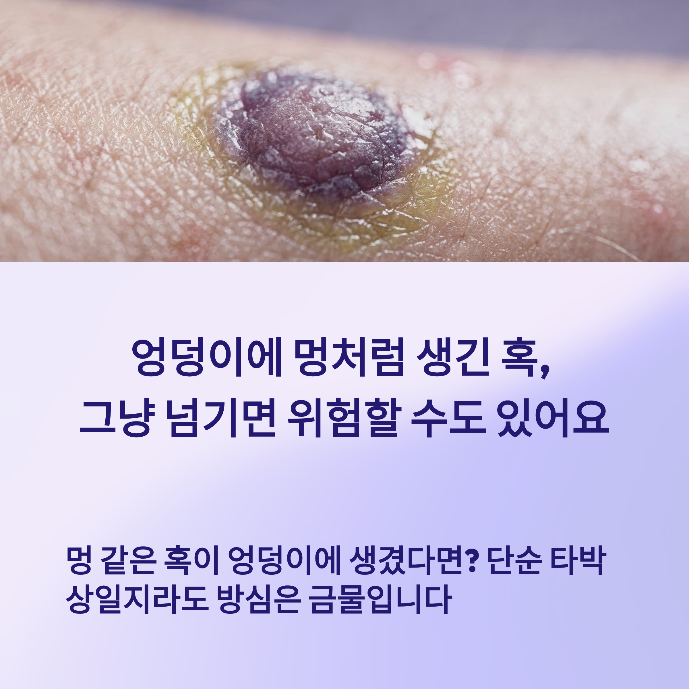 엉덩이에 멍처럼 보이는 혹이 생기면 대부분은 타박상이나 단순 피지낭종으로 생각하고 대수롭지 않게 여기는 경우가 많습니다. 하지만 혹의 형태나 색, 통증 유무에 따라 다양한 원인이 있을 수 있어요. 특히 시간이 지나도 가라앉지 않거나 점점 커진다면 반드시 확인이 필요합니다.
