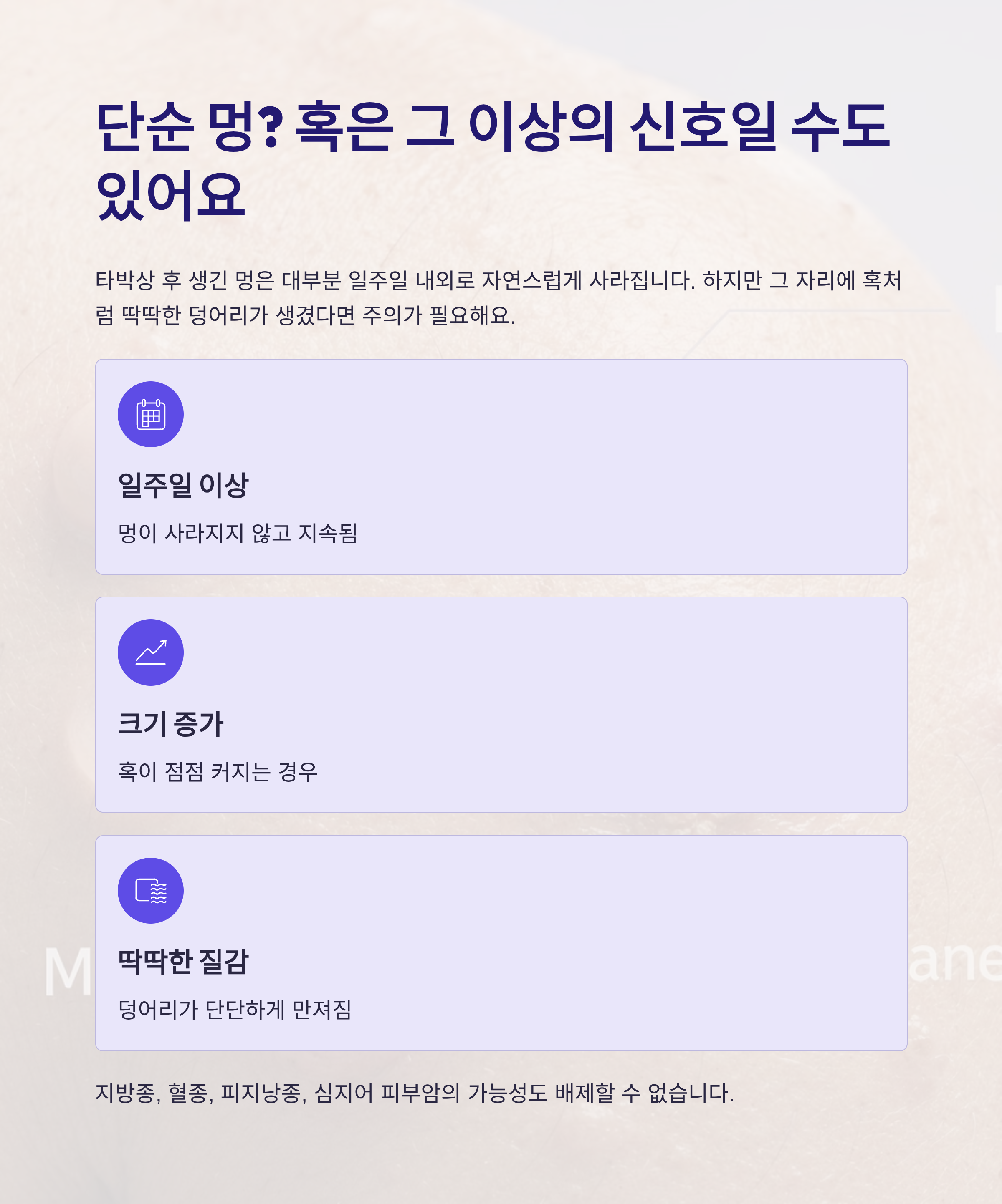 하지만 그 자리에 혹처럼 딱딱한 덩어리가 생겼거나 색이 점점 짙어진다면 단순 멍이 아닐 수도 있어요.