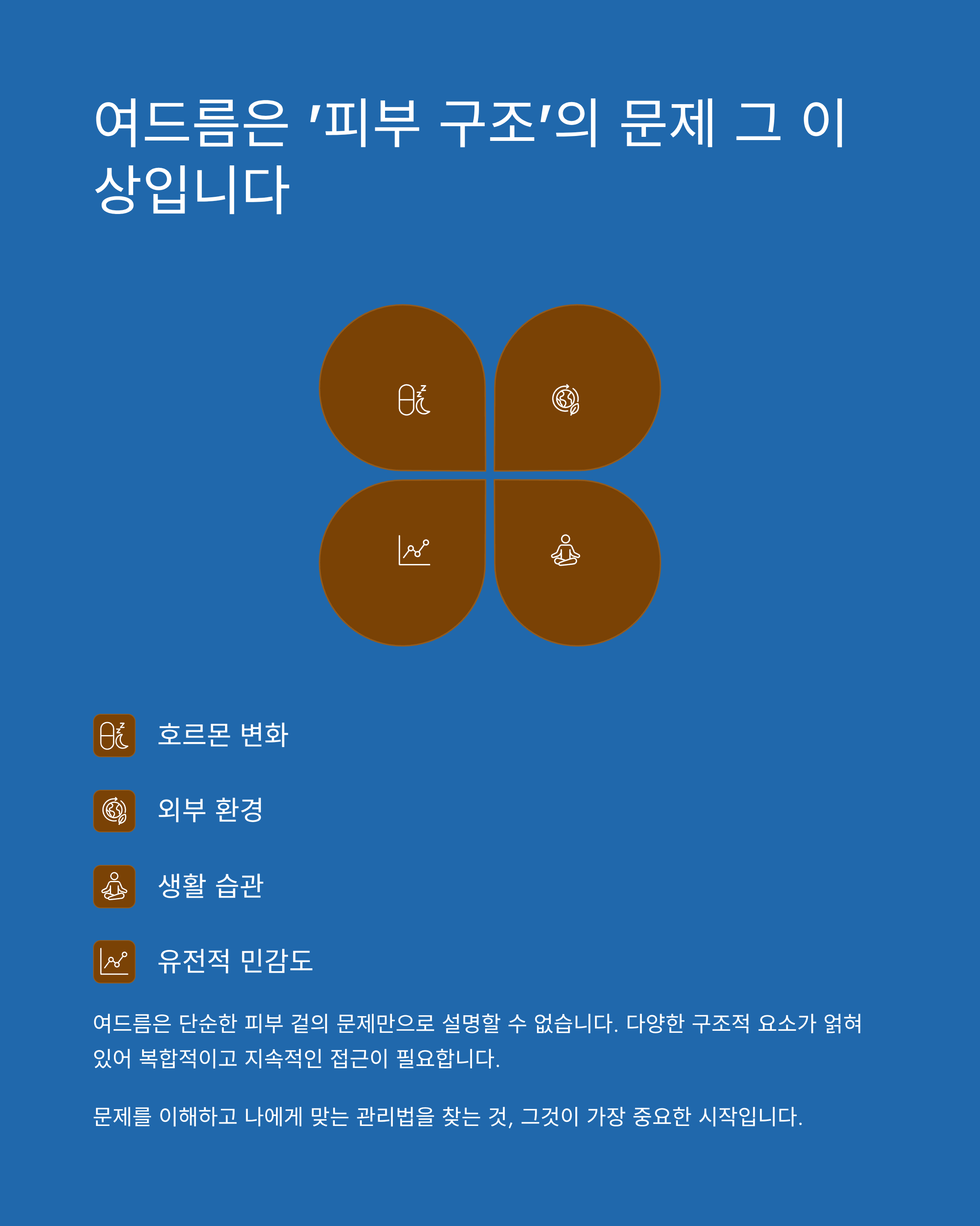 여드름은 단순한 피부 겉의 문제만으로 설명할 수 없습니다. 내부의 호르몬 변화, 외부 환경 자극, 생활 습관, 유전적 민감도 등 다양한 구조적 요소가 얽혀 있습니다. 따라서 단순한 해결책보다는 복합적이고 지속적인 접근이 필요합니다. 문제를 이해하고 나에게 맞는 관리법을 찾는 것, 그것이 가장 중요한 시작입니다.