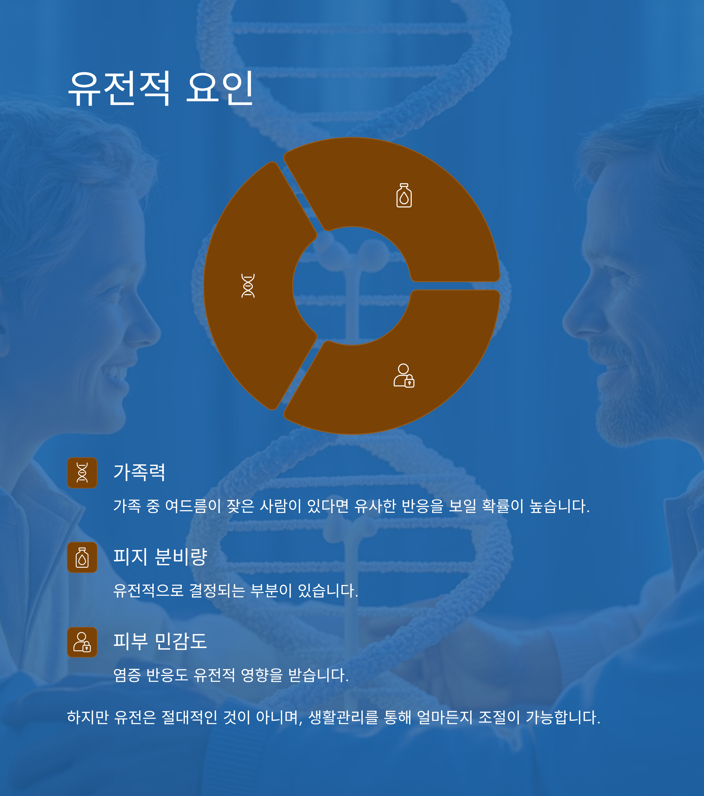 가족 중 여드름이 잦은 사람이 있다면, 본인도 유사한 반응을 보일 확률이 높습니다. 피지 분비량, 피부의 민감도, 염증 반응 등은 유전적으로 결정되는 부분이 있기 때문입니다. 하지만 유전은 절대적인 것이 아니며, 생활관리를 통해 얼마든지 조절이 가능합니다.