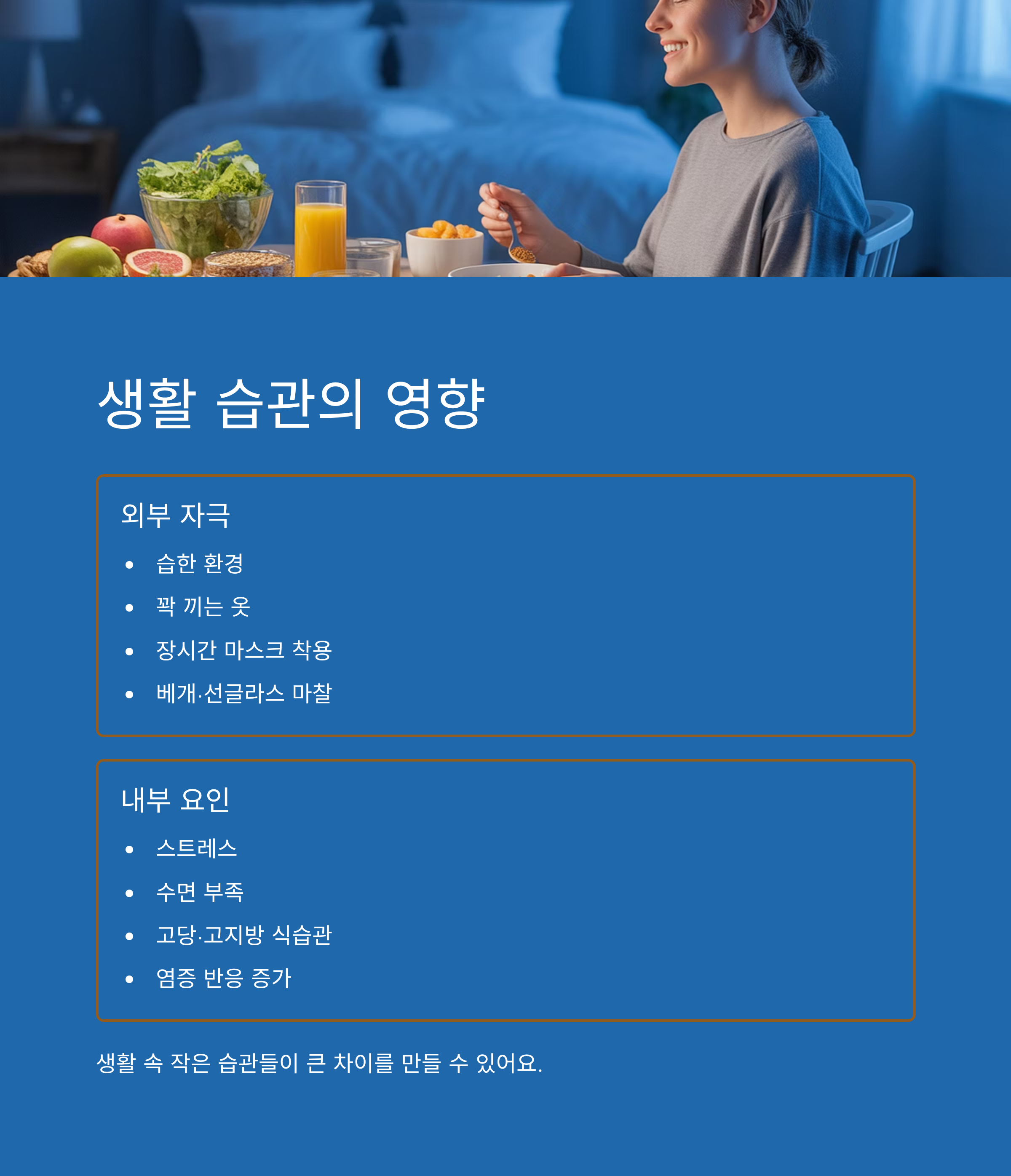 습한 환경, 꽉 끼는 옷, 장시간 마스크 착용, 베개·선글라스와의 마찰 등도 여드름을 유발할 수 있는 외부 자극입니다. 또한 스트레스, 수면 부족, 고당·고지방 위주의 식습관도 피지 분비를 촉진하거나 염증 반응을 증가시킬 수 있습니다. 생활 속 작은 습관들이 큰 차이를 만들 수 있어요.