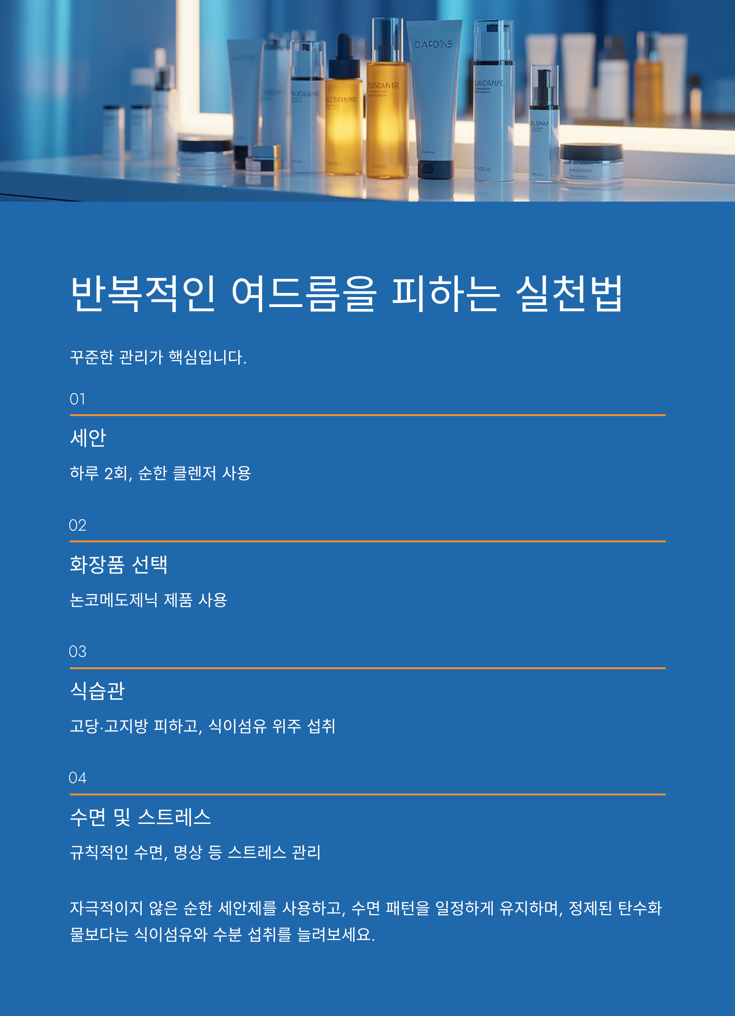 여드름은 단순한 피부 겉의 문제만으로 설명할 수 없습니다. 내부의 호르몬 변화, 외부 환경 자극, 생활 습관, 유전적 민감도 등 다양한 구조적 요소가 얽혀 있습니다. 따라서 단순한 해결책보다는 복합적이고 지속적인 접근이 필요합니다. 문제를 이해하고 나에게 맞는 관리법을 찾는 것, 그것이 가장 중요한 시작입니다.
