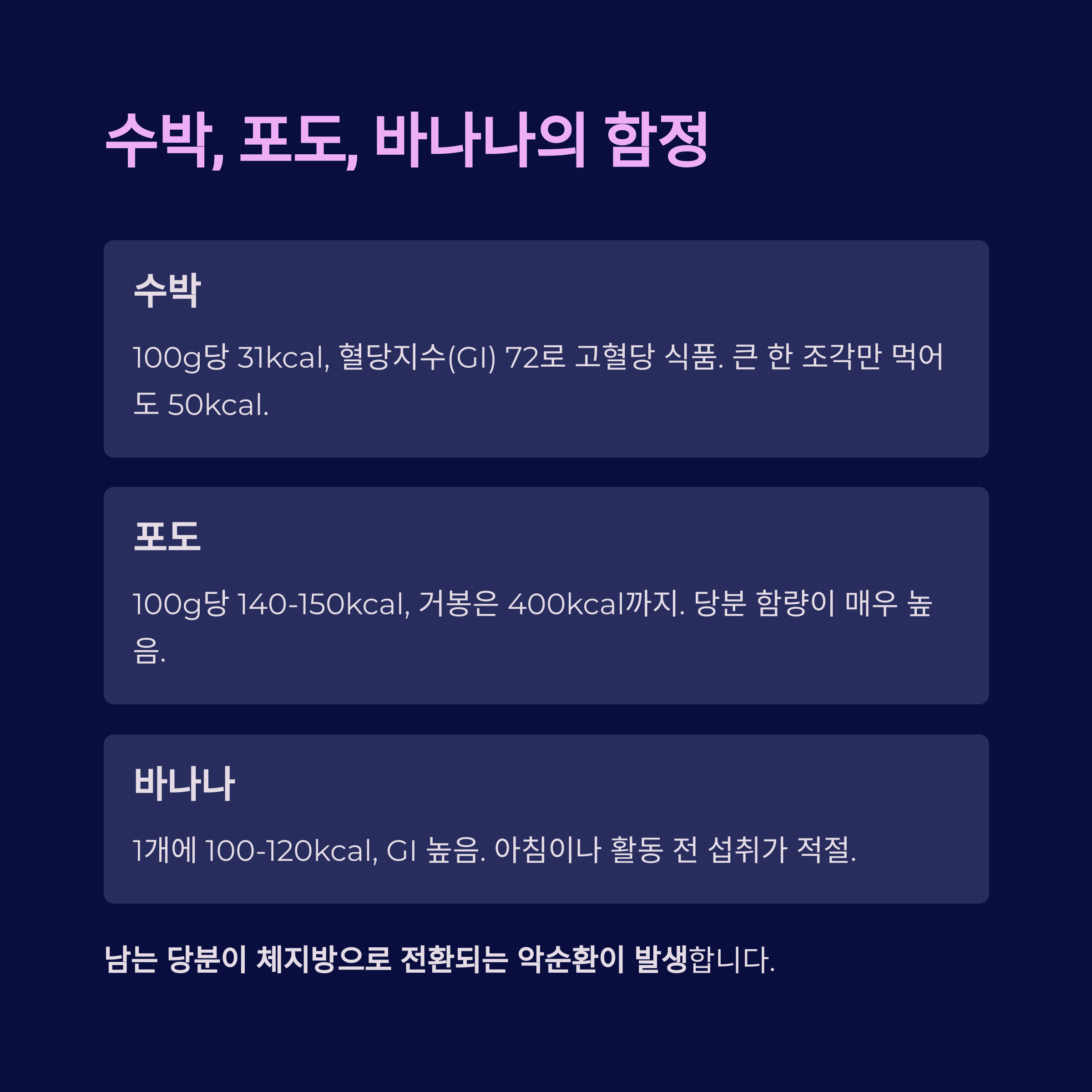 | 수박 | 31kcal | 72 | 당분↑, 포만감↓ |