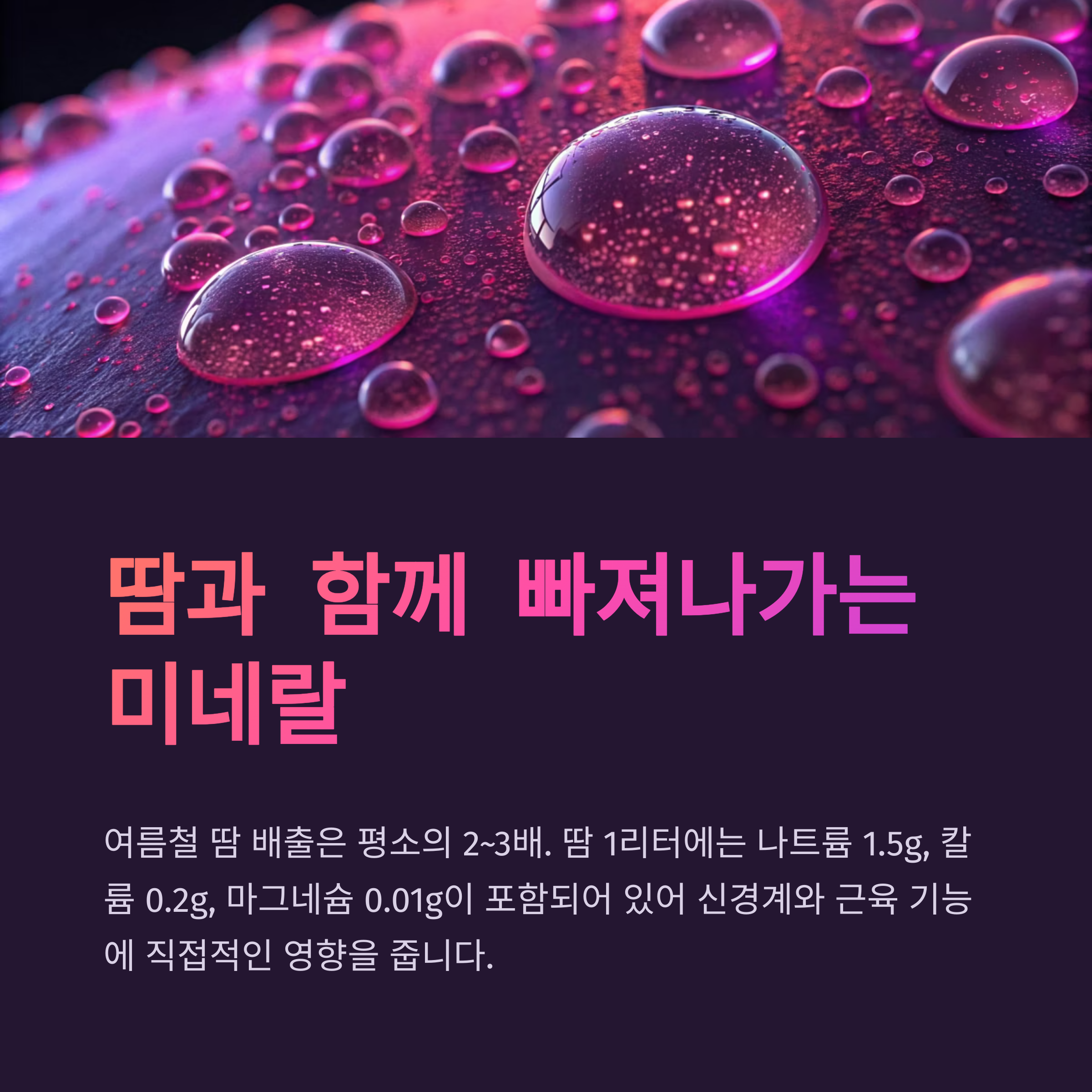 여름철 땀 배출은 평소의 2배~3배 수준입니다. 땀 1리터에는 약 1.5g의 나트륨과
