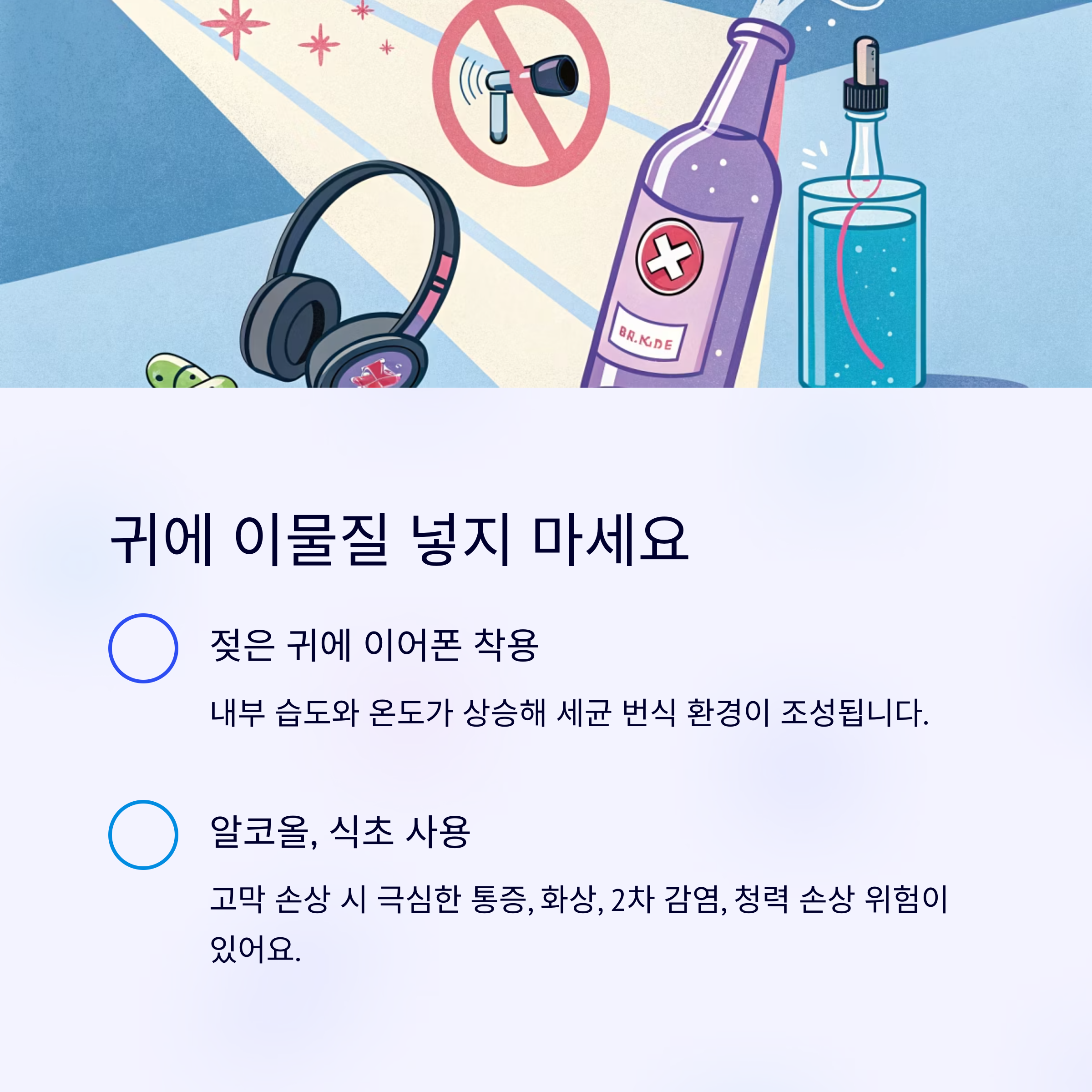귀에 이어폰, 알코올, 식초 등 넣기 젖은 상태 이어폰 사용 시 세균 번식, 알코올·식초 사용 시 화상 및 감염 위험