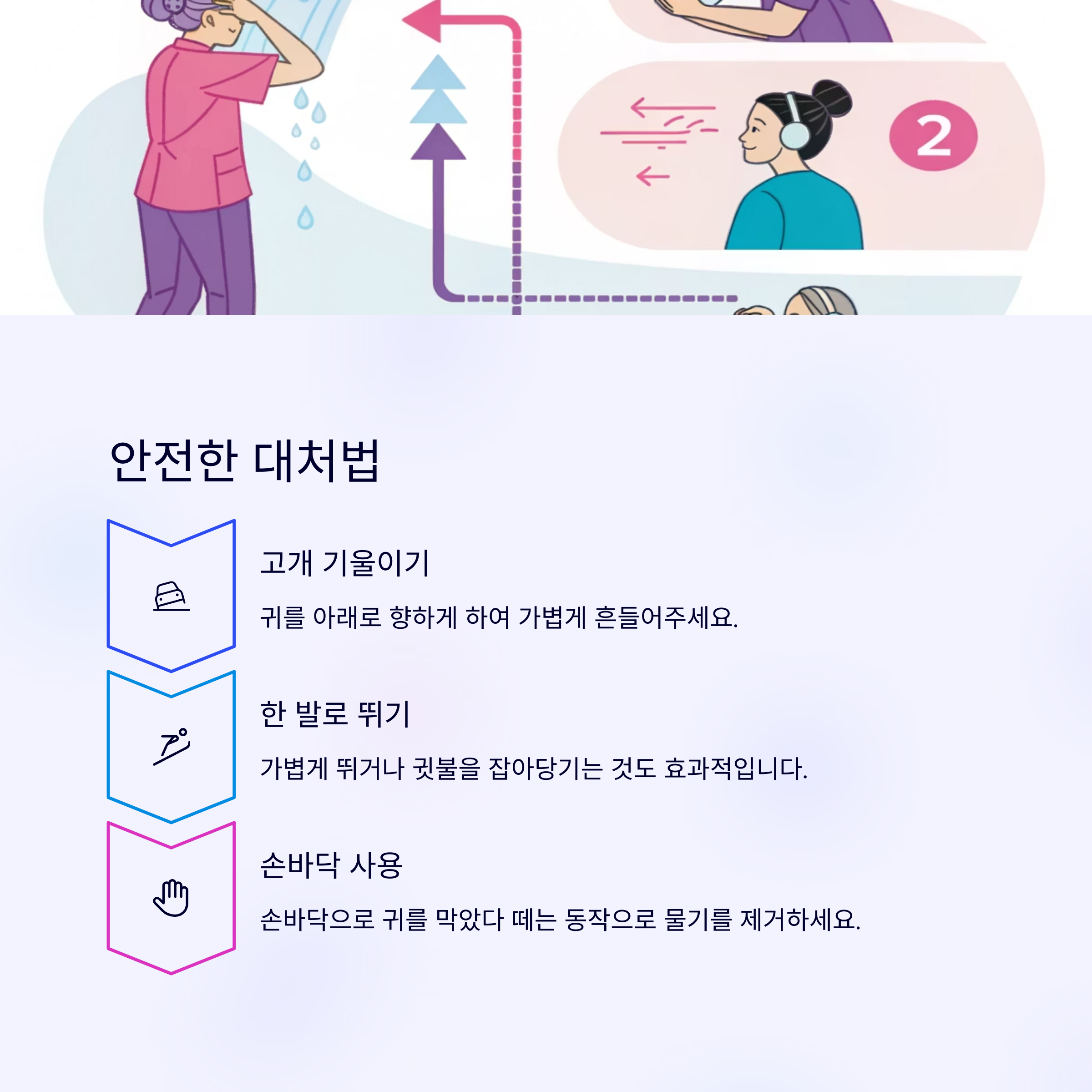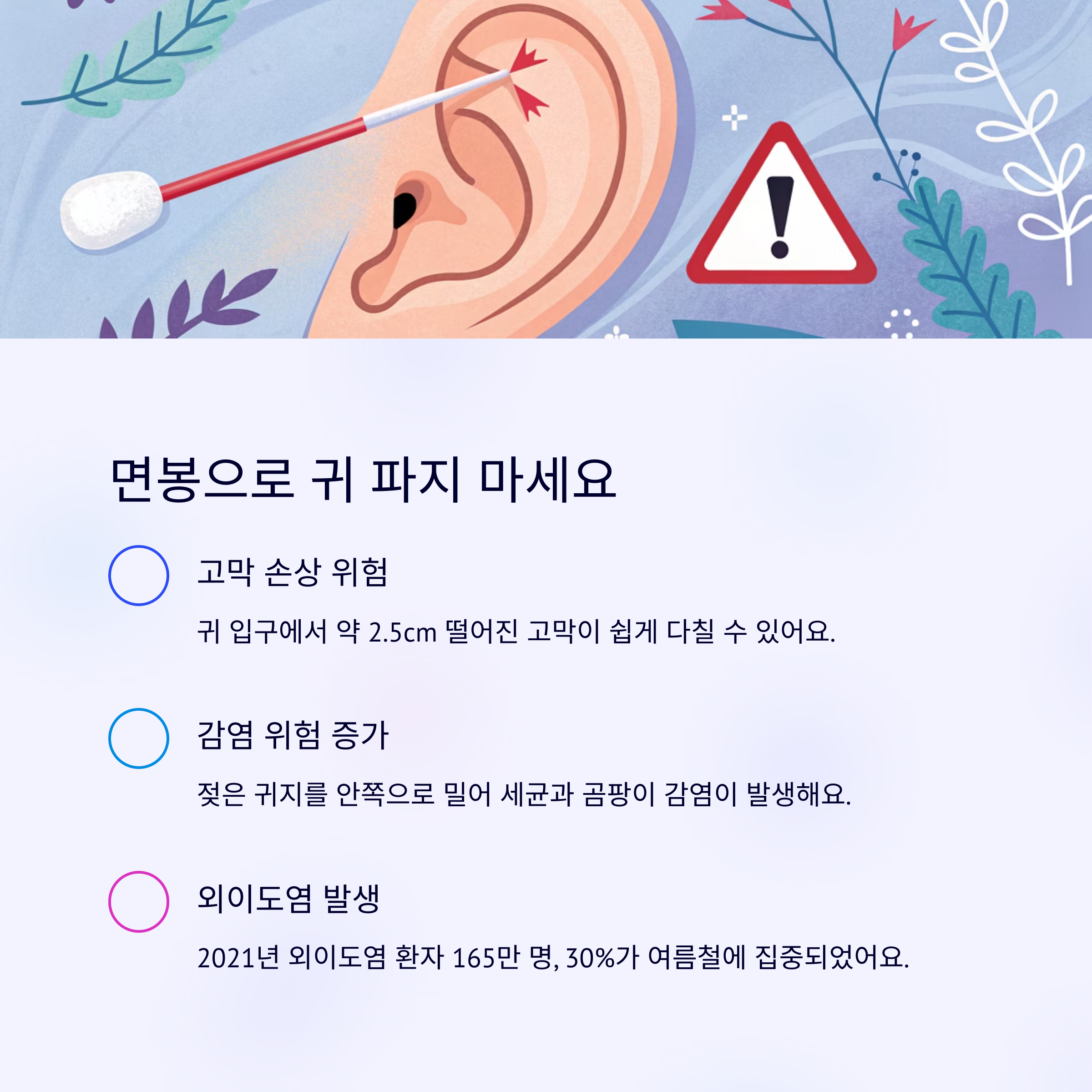 하지만 이때 잘못된 행동을 하면 외이도염, 중이염, 청력 손상 등 심각한 합병증으로 이어질 수 있습니다.