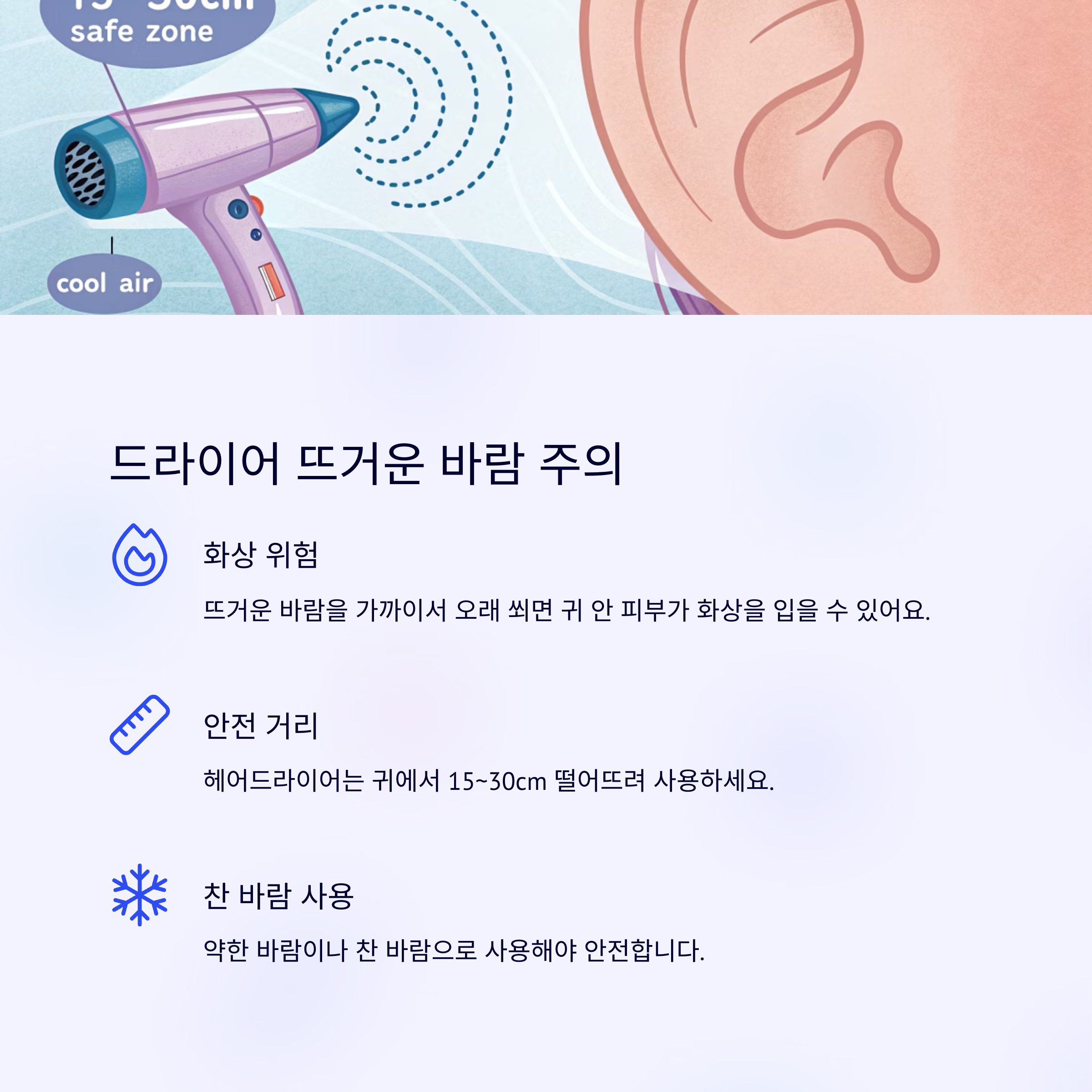 | 드라이어 뜨거운 바람 가까이 쐬기 | 귀 안 화상 위험, 15cm에서 30cm 거리 유지, 약한 바람 사용 권장 |