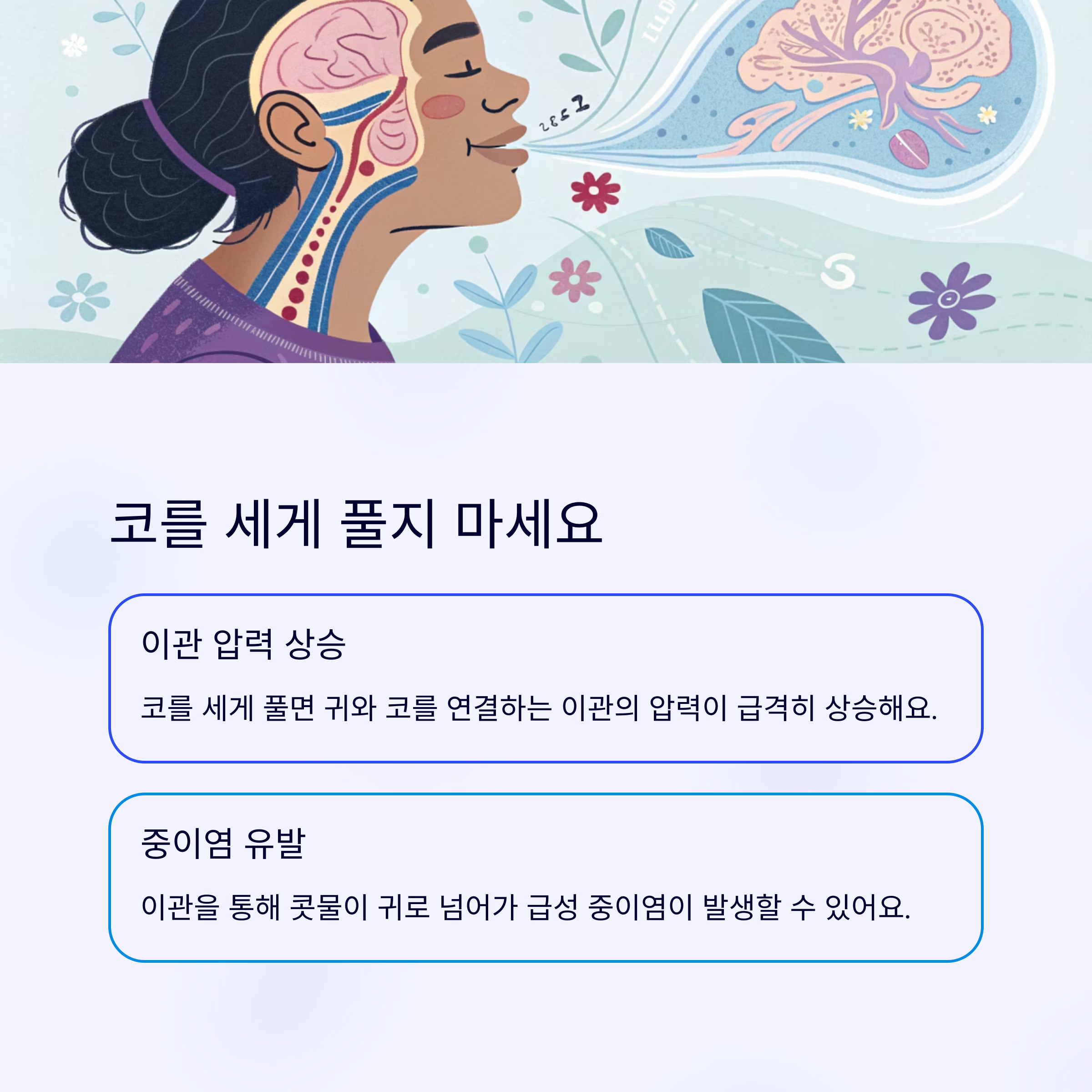 | 코를 세게 풀기 | 급성 중이염 유발, 이관 통한 콧물 이동, 염증 발생 |