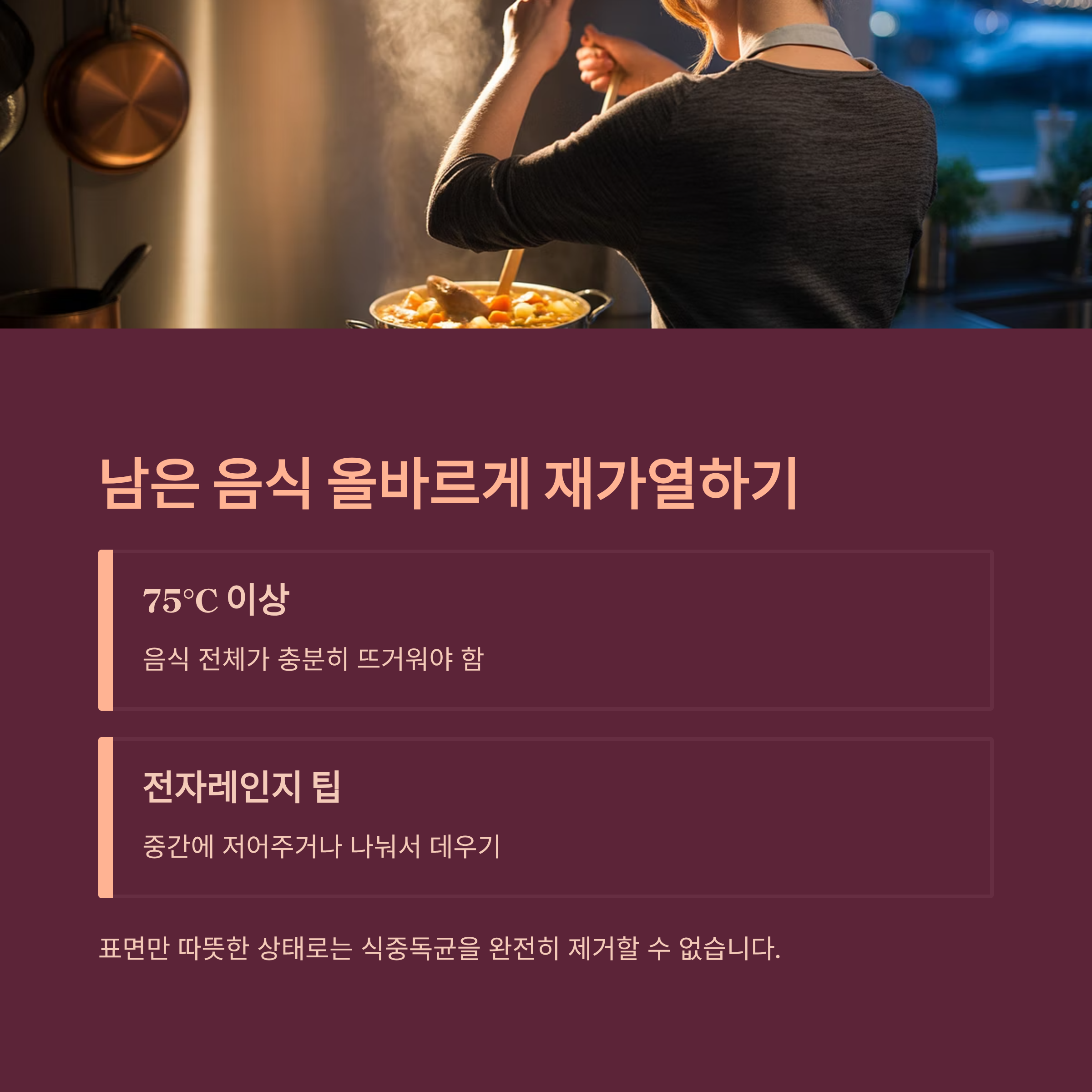 음식 전체가 75도 이상이 되도록 충분히 데워야 식중독균을 완전히 없앨 수 있어요.