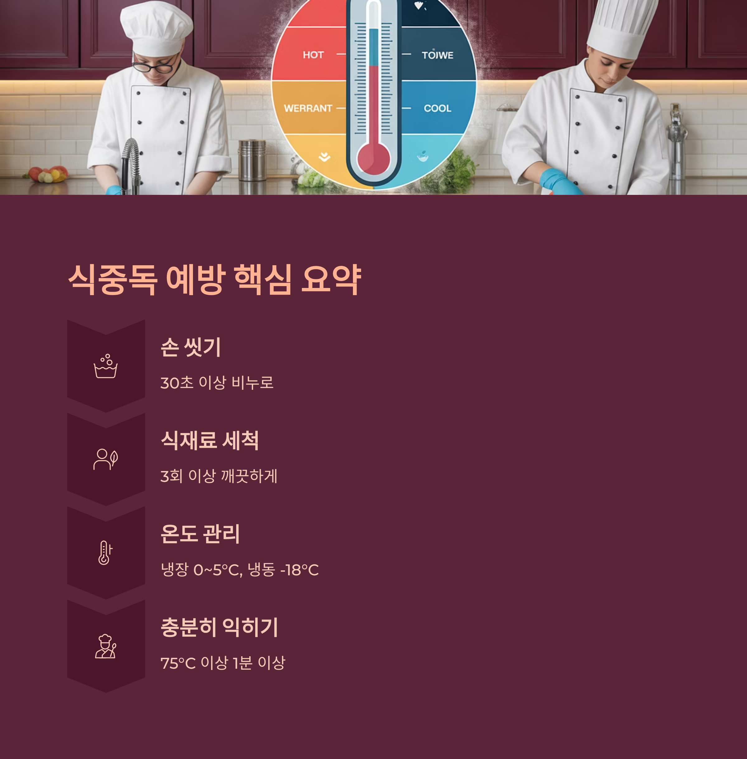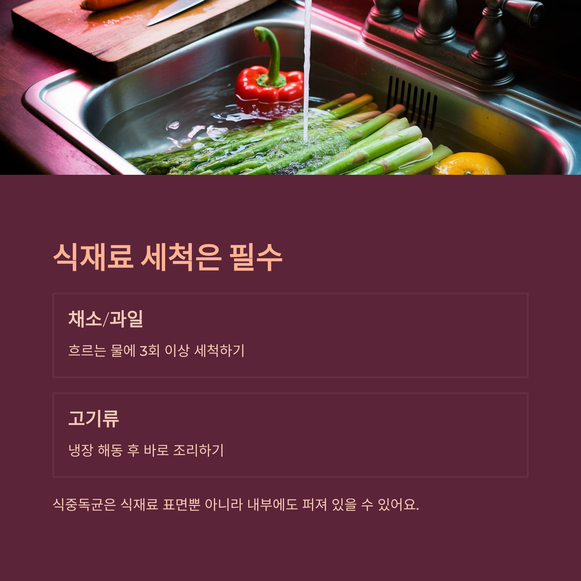 | 식재료 세척 | 채소는 3회 이상, 고기는 해동 후 바로 조리 |