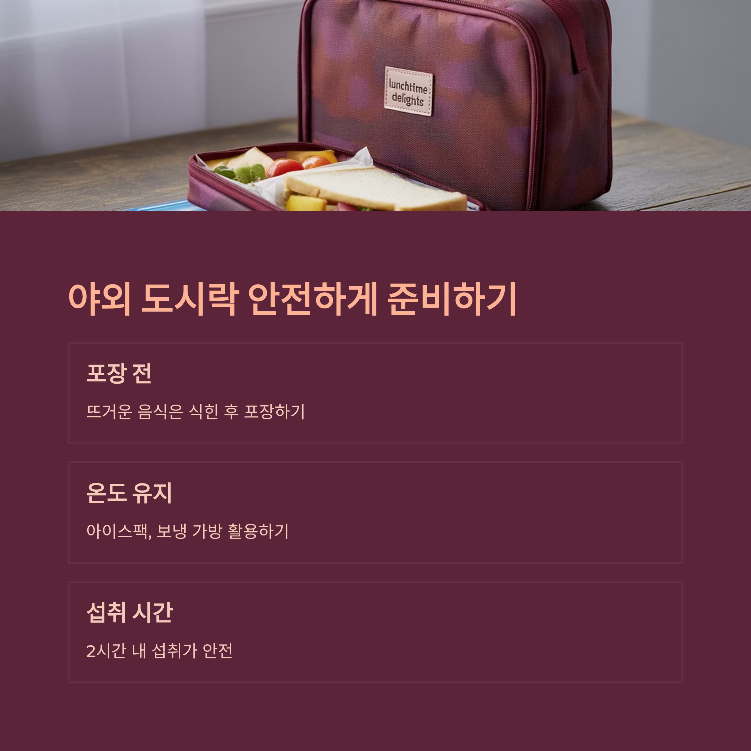 도시락은 가급적 2시간 내에 섭취하는 것이 안전하며, 유제품이나 날 음식은 피하는 게 좋아요.