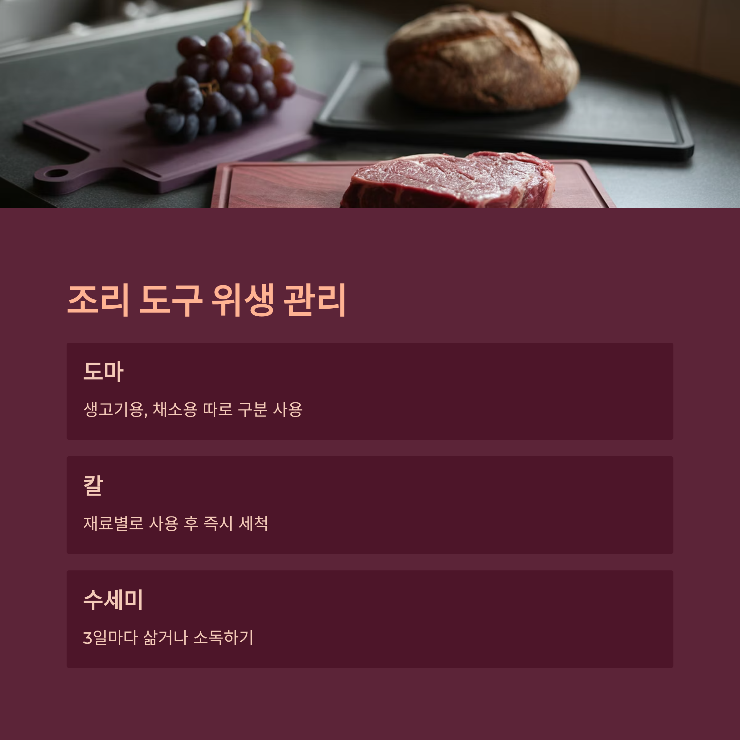 특히 생고기와 채소를 같은 도마로 쓰는 건 위험해요. 재질이나 용도를 구분해서 사용하고, 매일 뜨거운 물이나 식초로 소독하세요.