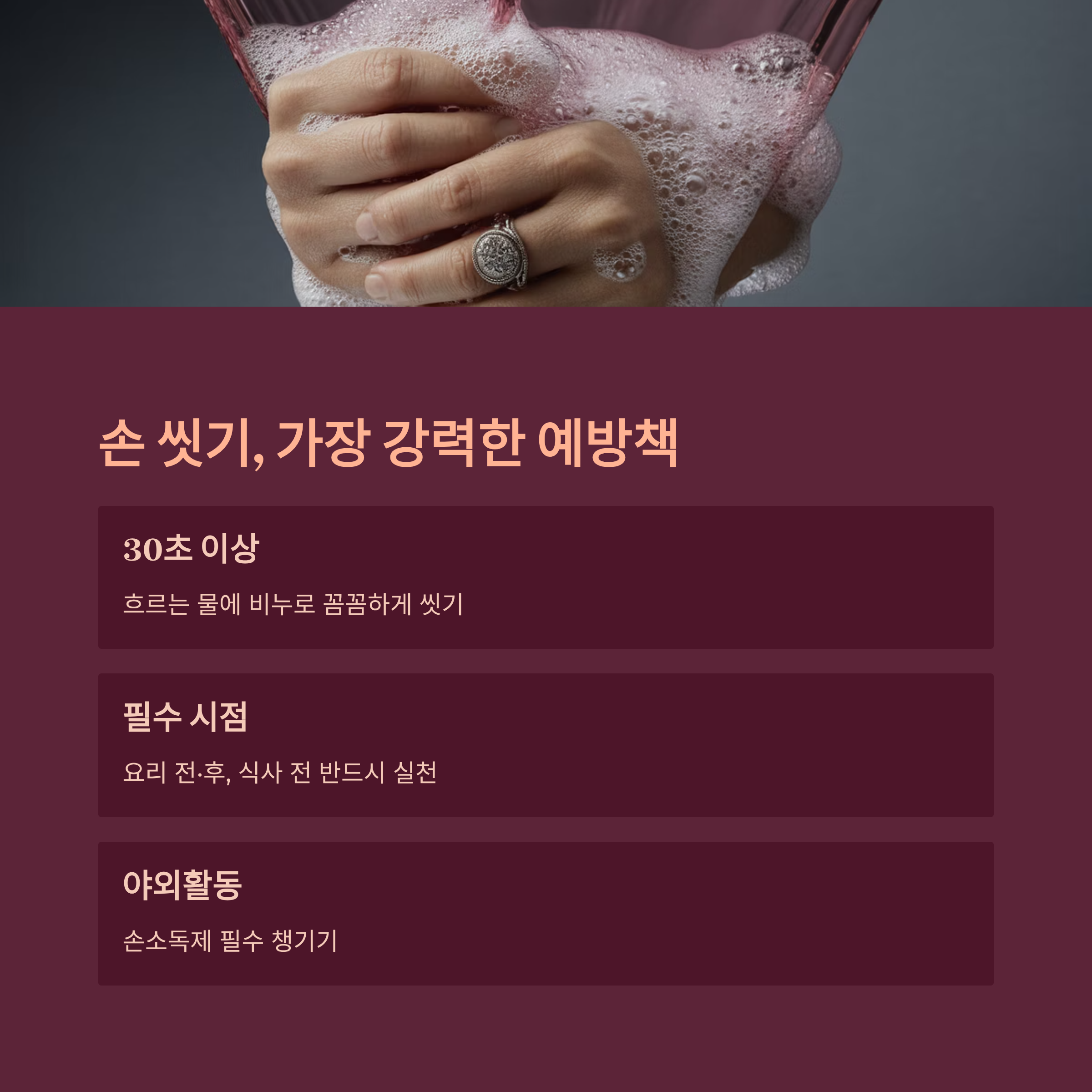 흐르는 물에 비누로 30초 이상, 특히 요리 전·후, 식사 전에는 반드시 손을 깨끗하게 씻어야 해요.