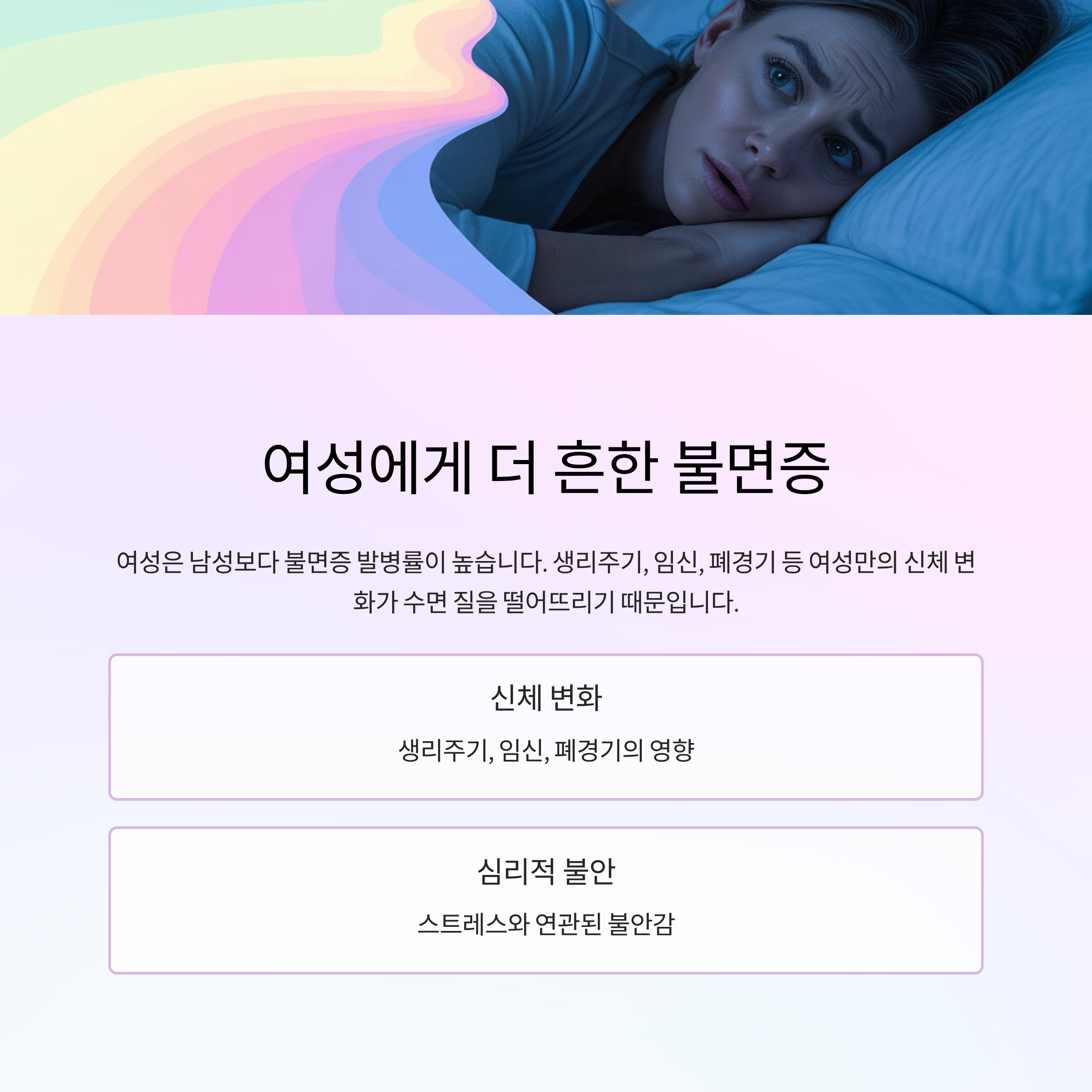 여성은 남성보다 불면증 발병률이 높은 편입니다. 생리주기, 임신, 폐경기 등 여성만의 신체 변화가 수면의 질을 떨어뜨리기 때문이죠. 스트레스와 연관된 심리적 불안도 중요한 원인으로 꼽힙니다.