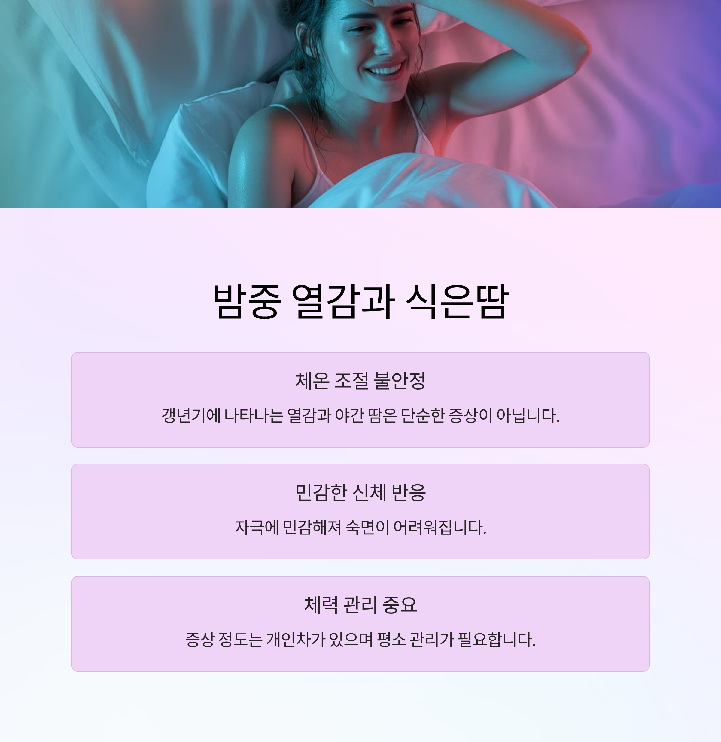 | 폐경기 변화 | 호르몬 감소, 열감 | 수면 질 저하 및 중단 |