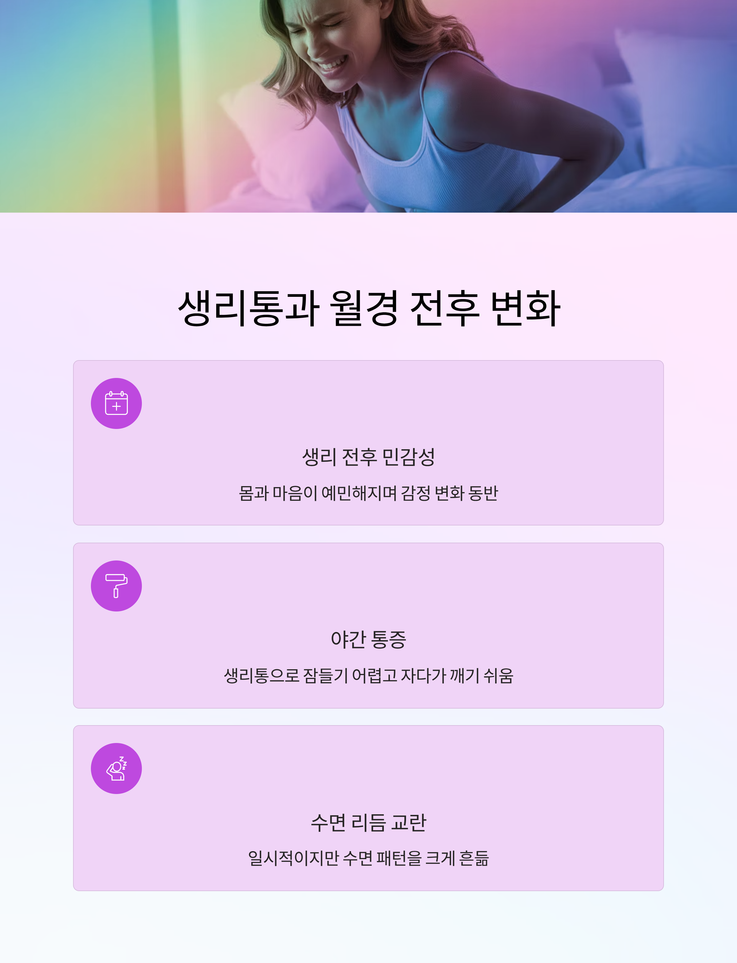 | 생리통 및 PMS | 복통, 감정 변화 | 야간 통증으로 각성 유발 |