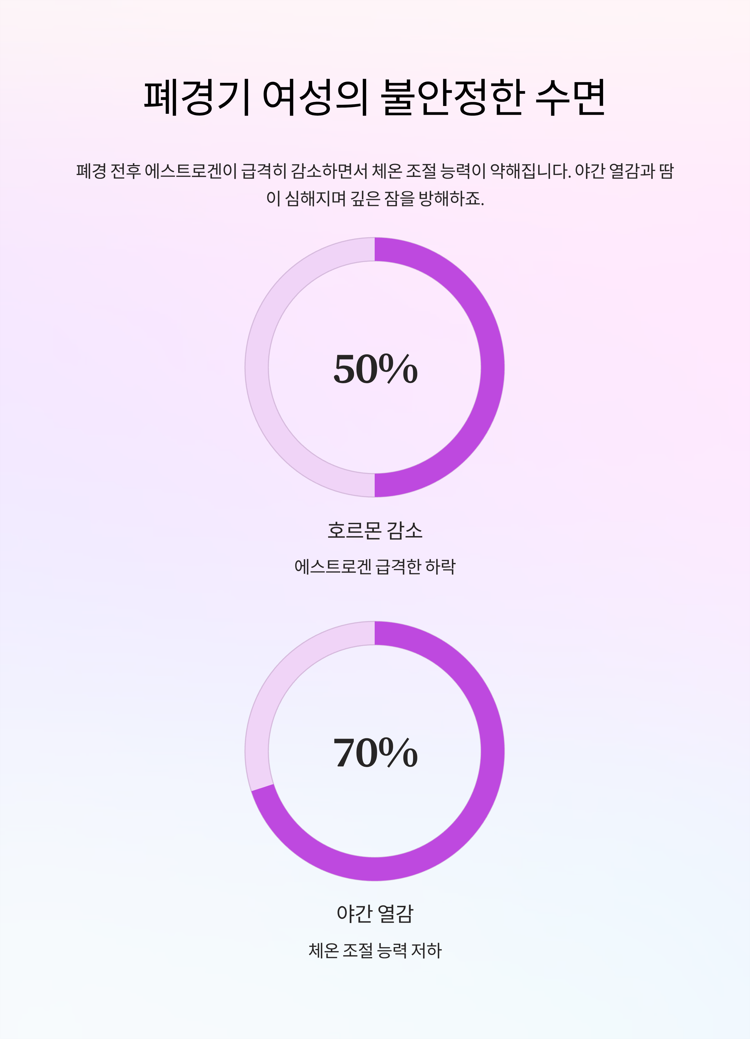 폐경 전후로 여성 호르몬인 에스트로겐이 급격히 줄어들면서, 신체 내부의 열 조절 능력이 약해지고 야간에 열감과 땀이 심해지는 경우가 많습니다. 이런 증상은 수면을 자주 방해하며 깊은 잠을 방해하죠.
