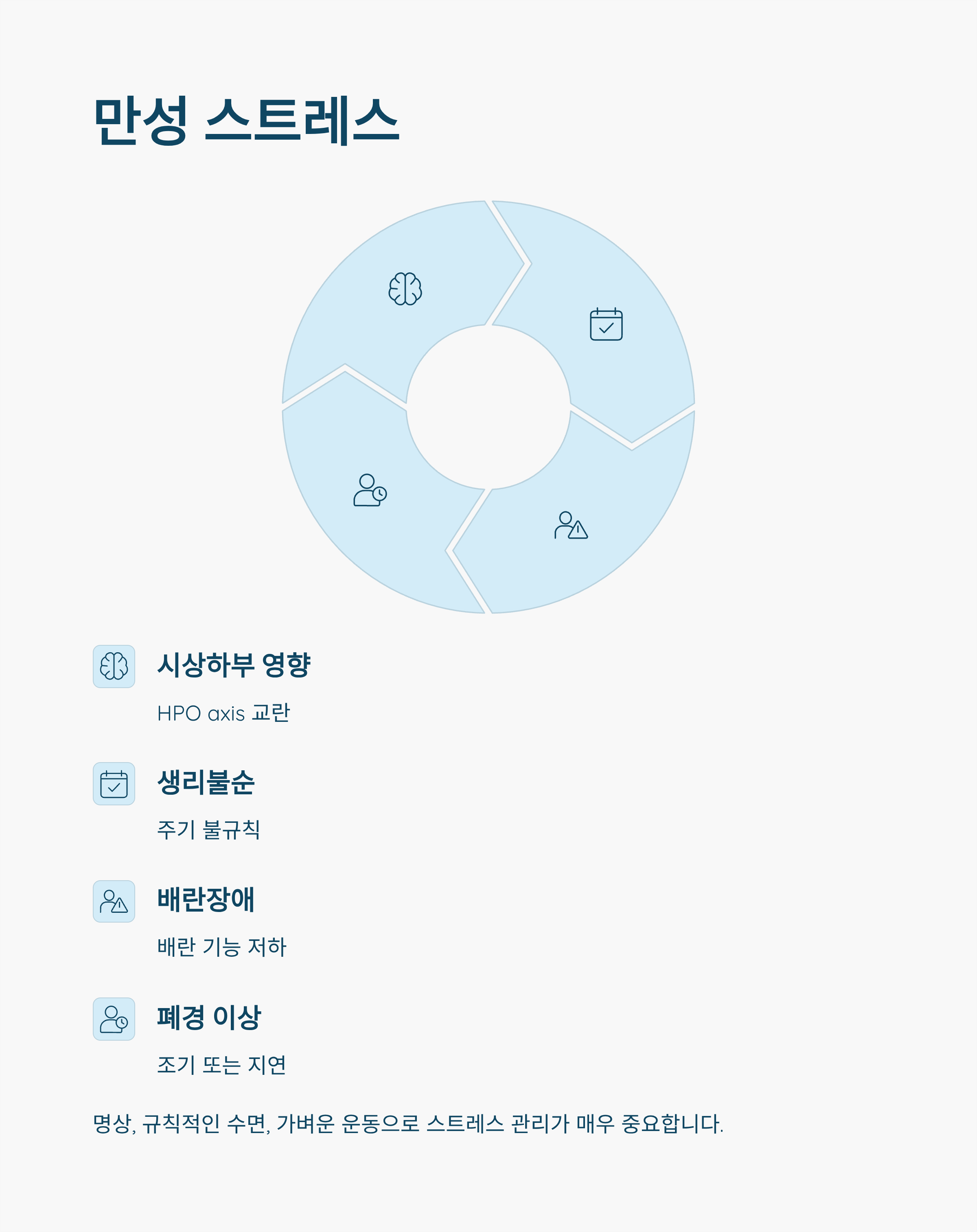 지속적인 스트레스는 시상하부-뇌하수체-난소 축(HPO axis)에 직접적인 영향을 주며, 생리불순, 배란장애, 폐경 이행 지연 또는 조기폐경 등을 유발할 수 있습니다.