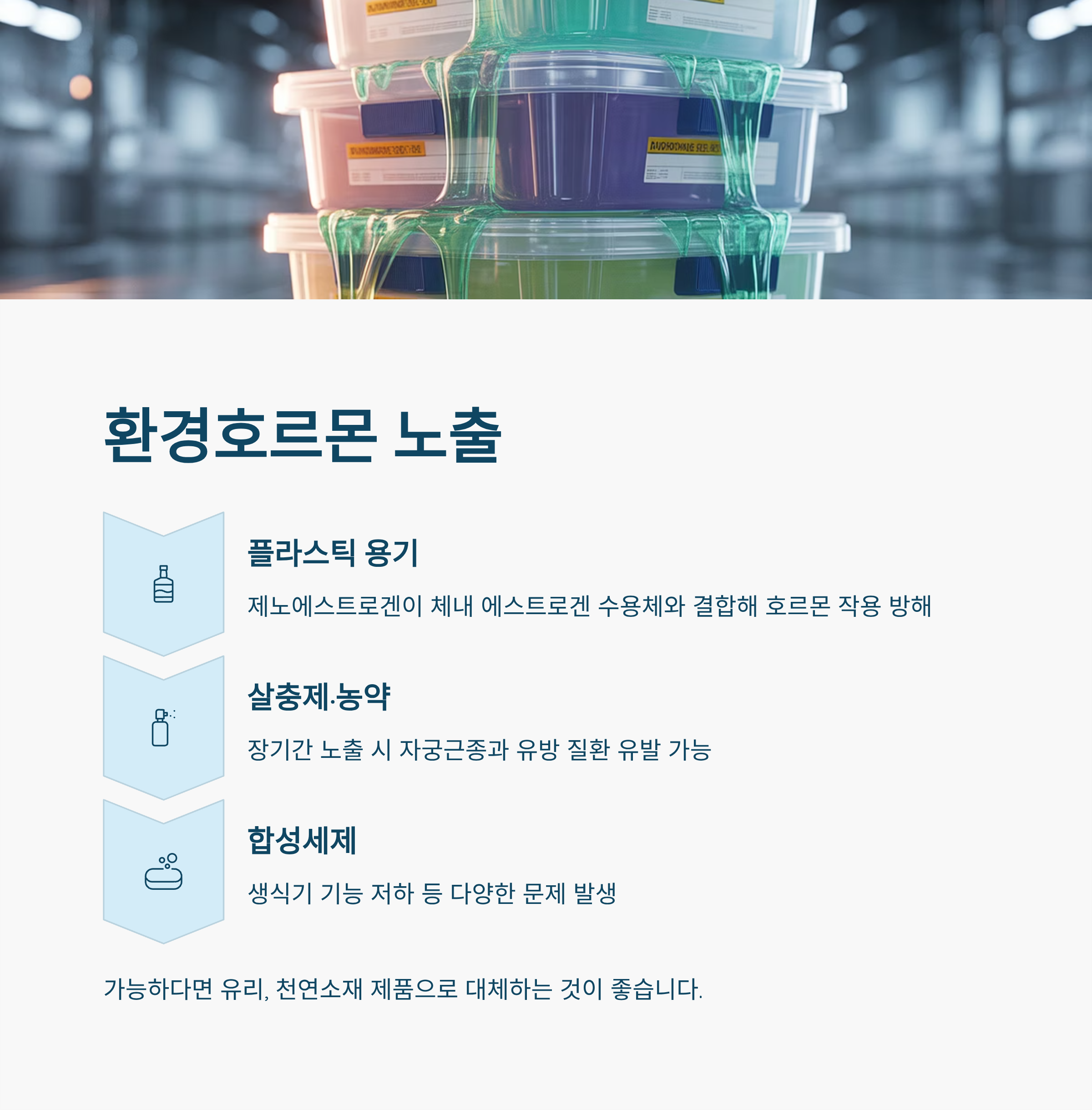 플라스틱, 살충제, 농약, 합성세제에 포함된 환경호르몬(제노에스트로겐)은 체내 에스트로겐 수용체와 유사한 구조를 지니고 있어 여성 호르몬의 정상적인 작용을 방해합니다.