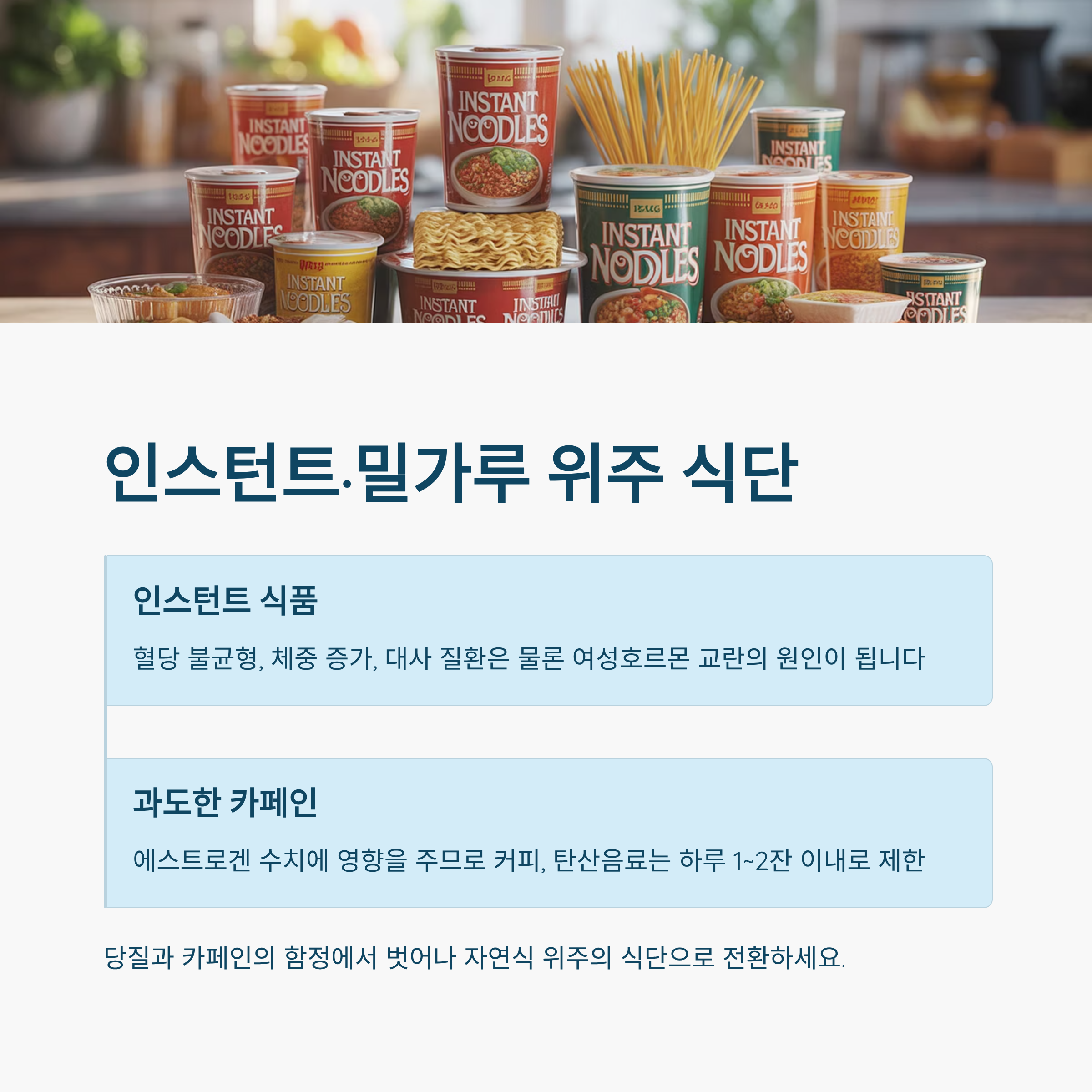 잦은 인스턴트 식품 섭취는 혈당 불균형, 체중 증가, 대사 질환은 물론 여성호르몬 교란의 원인이 됩니다.