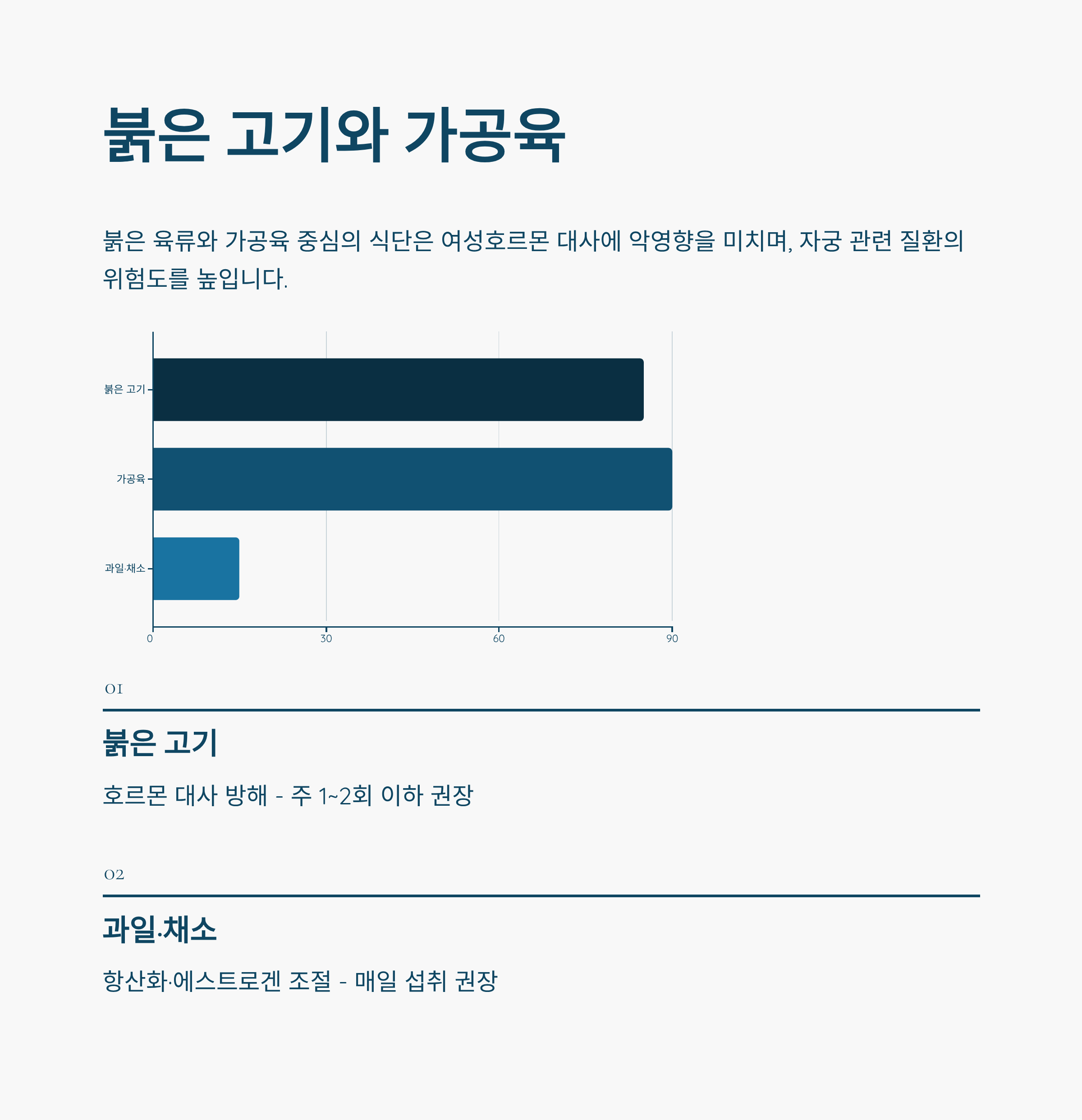 붉은 육류와 가공육 중심의 식단은 여성호르몬 대사에 악영향을 미칠 수 있으며, 장기적으로는 자궁 관련 질환의 위험도를 높일 수 있습니다.