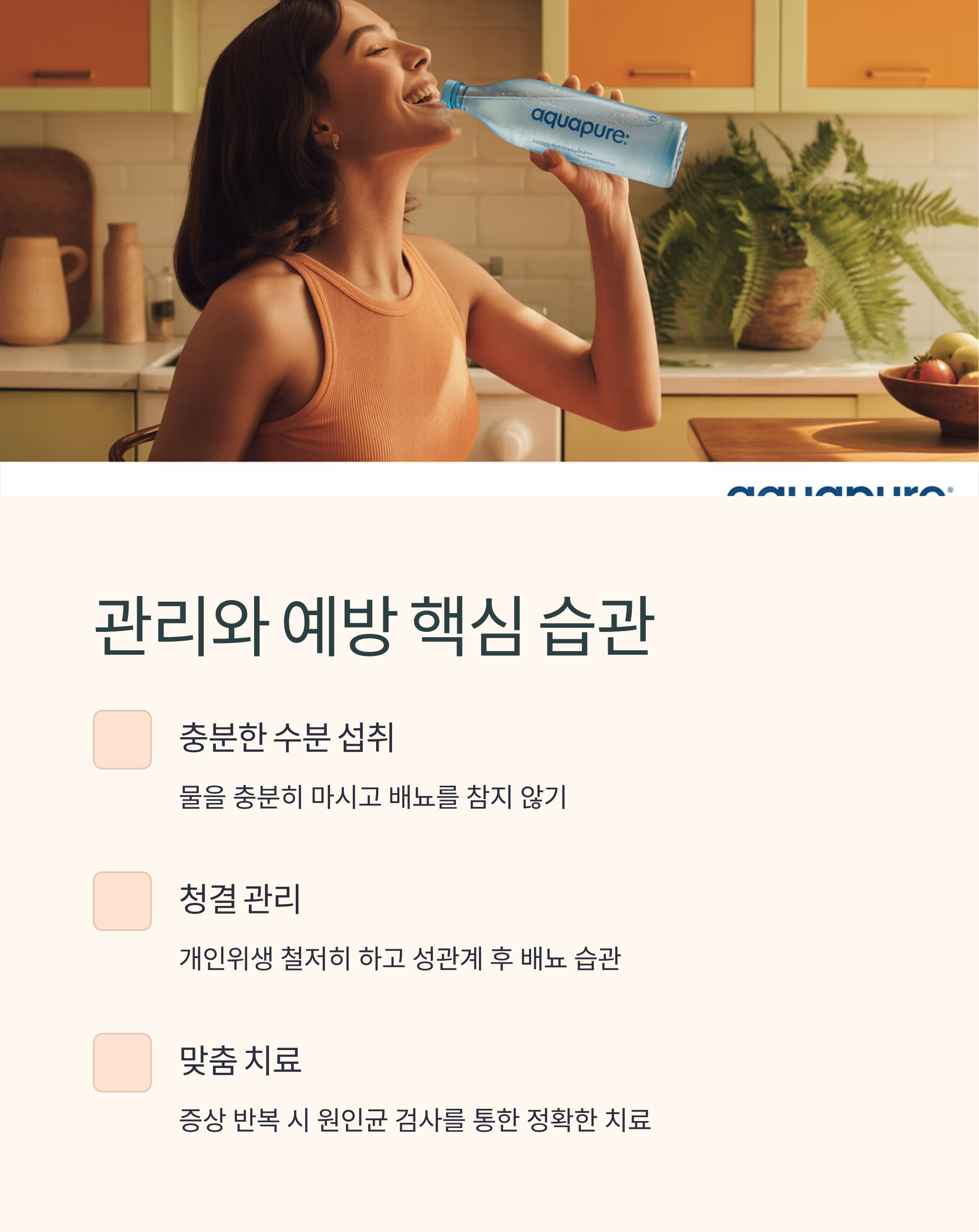 물 충분히 섭취하기, 배뇨 참지 않기, 청결 관리, 성관계 후 배뇨 습관 등이 기본입니다. 또한 증상이 반복될 경우 반드시 원인균 검사를 통한 맞춤 치료가 필요합니다.