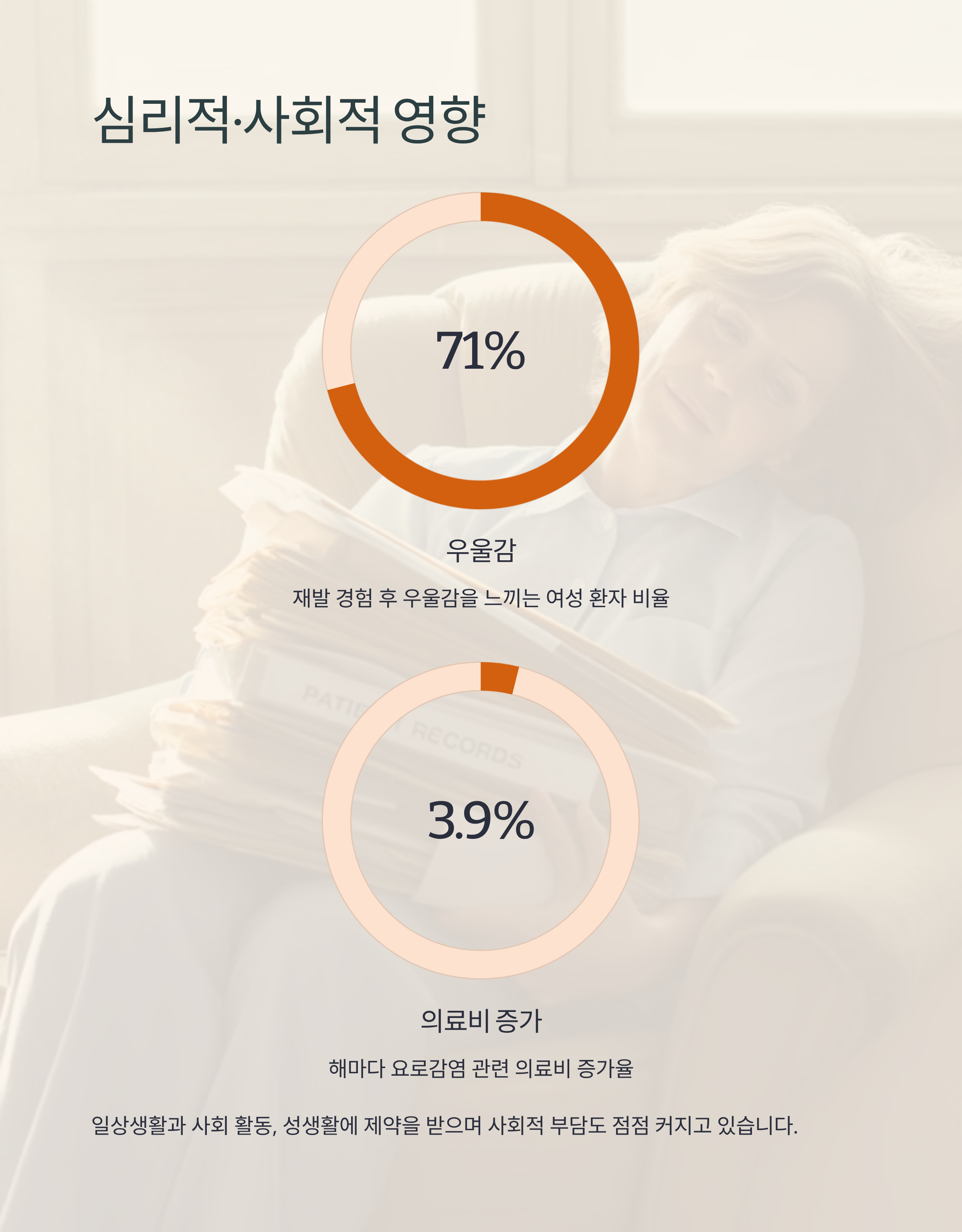 여성 환자의 71%가 재발 경험 후 우울감을 느끼며, 일상생활과 사회 활동, 성생활에 제약을 받습니다. 또한 해마다 요로감염 관련 의료비가 약 3.9% 증가하고 있어 사회적 부담도 점점 커지고 있습니다.