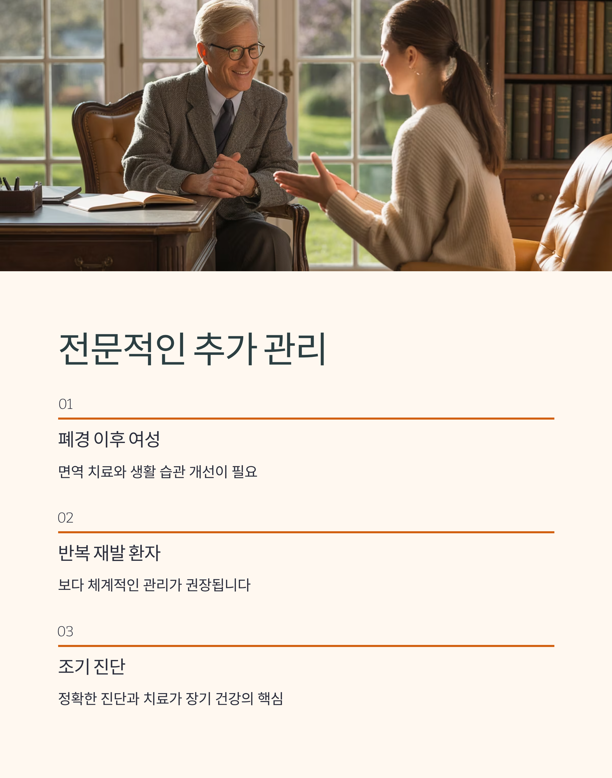특히 폐경 이후 여성이나 반복 재발 환자는 면역 치료, 생활 습관 개선 등 보다 체계적인 관리가 권장됩니다. 조기에 정확한 진단과 치료를 받는 것이 장기적인 건강을 지키는 핵심입니다.