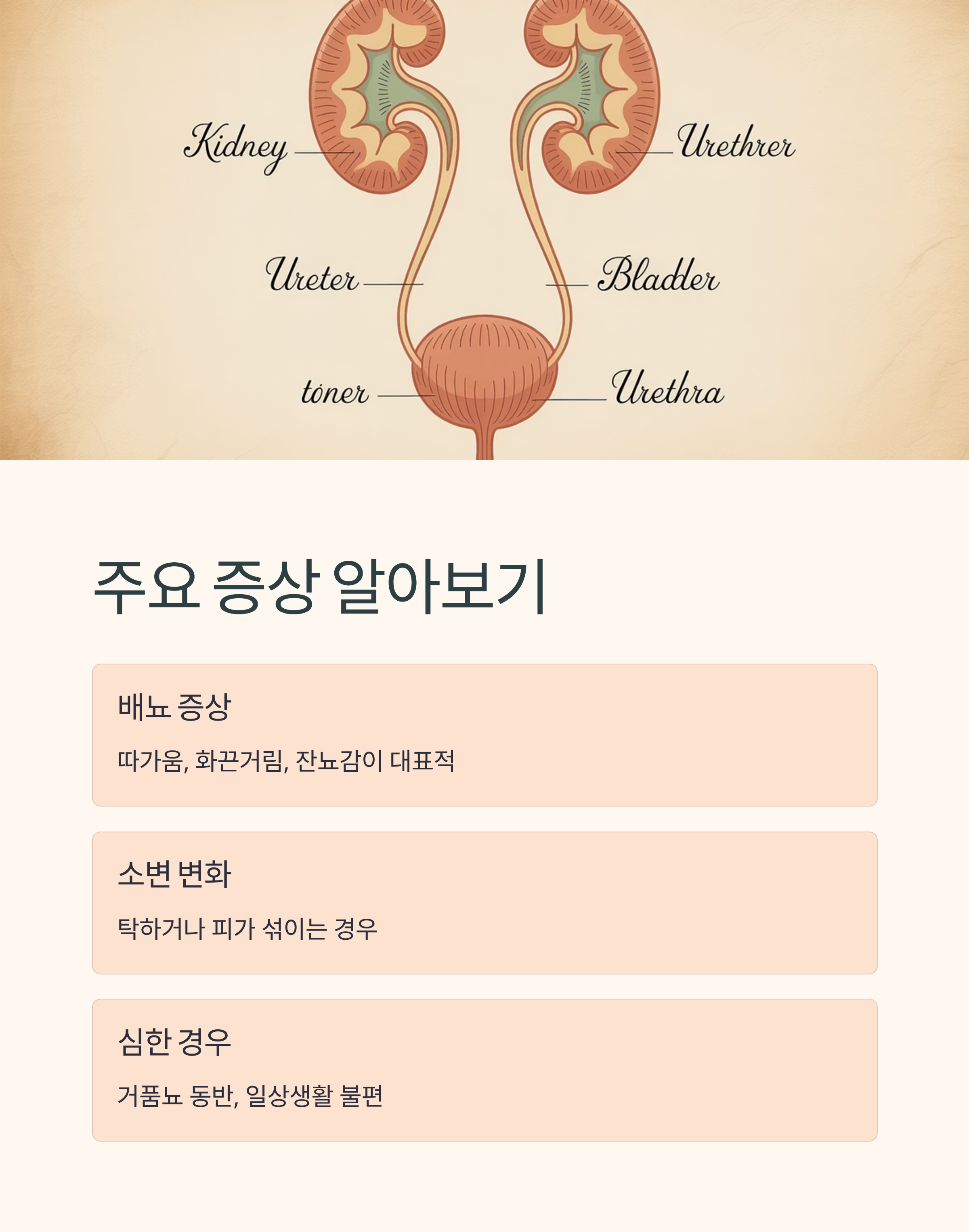 배뇨 시 따가움, 화끈거림, 잔뇨감이 대표적이며 소변이 탁하거나 피가 섞이는 경우도 있습니다. 심한 경우 거품뇨가 동반되기도 하고, 지속되면 일상생활에 큰 불편을 줍니다.