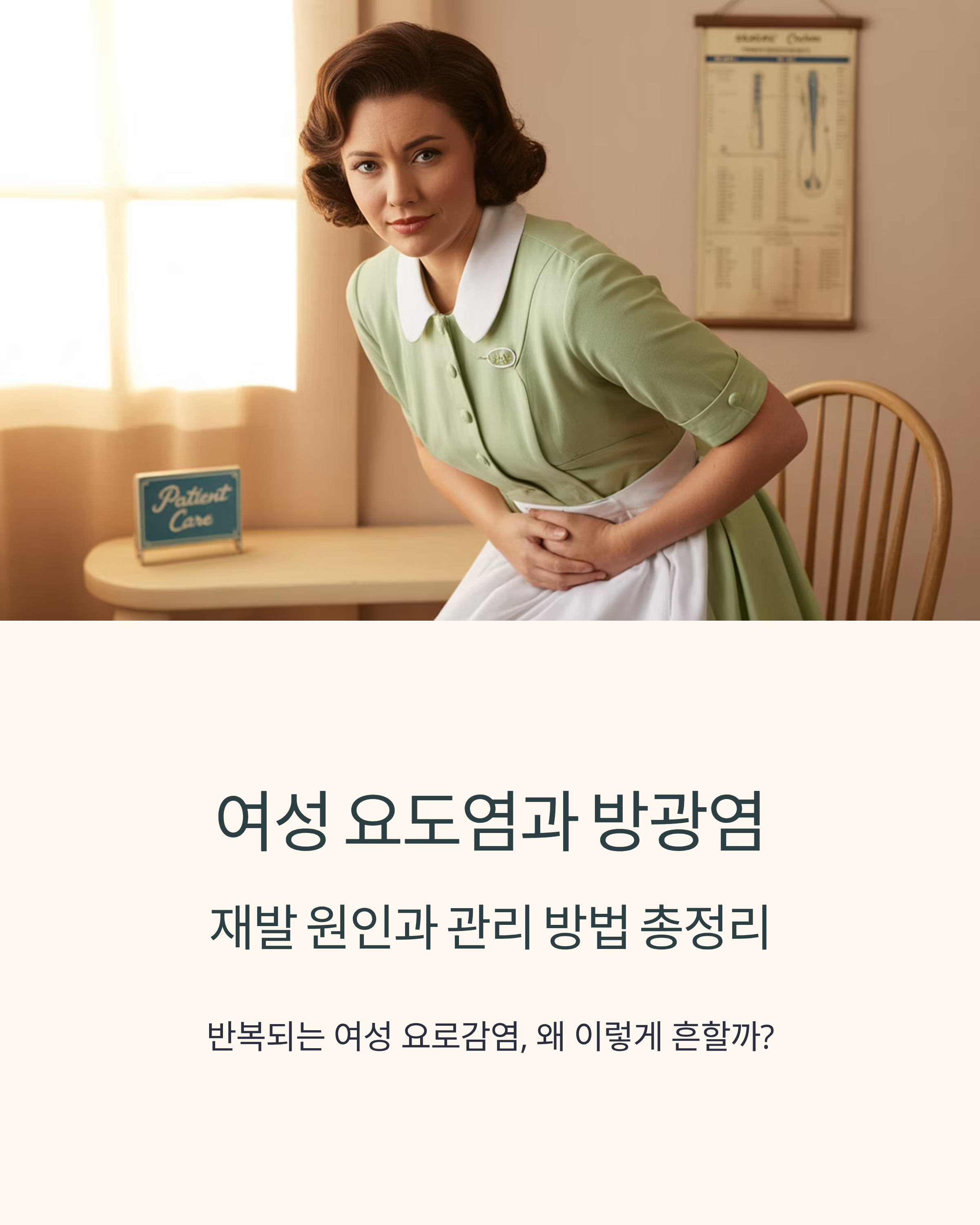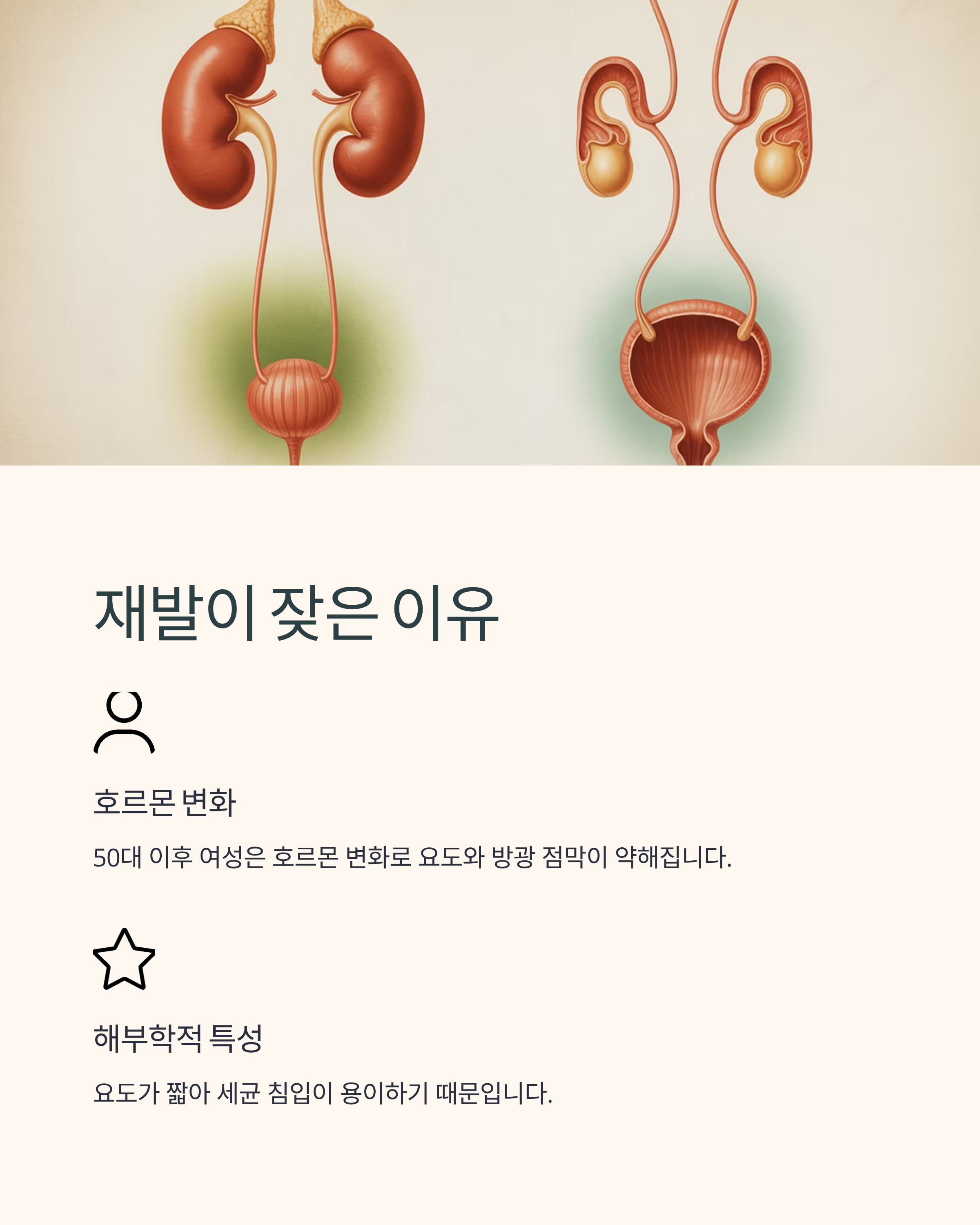 50대 이후 여성은 호르몬 변화로 인해 요도와 방광 점막이 약해져 재발 위험이 증가합니다. 또한 해부학적 특성상 요도가 짧아 세균 침입이 용이하기 때문입니다.